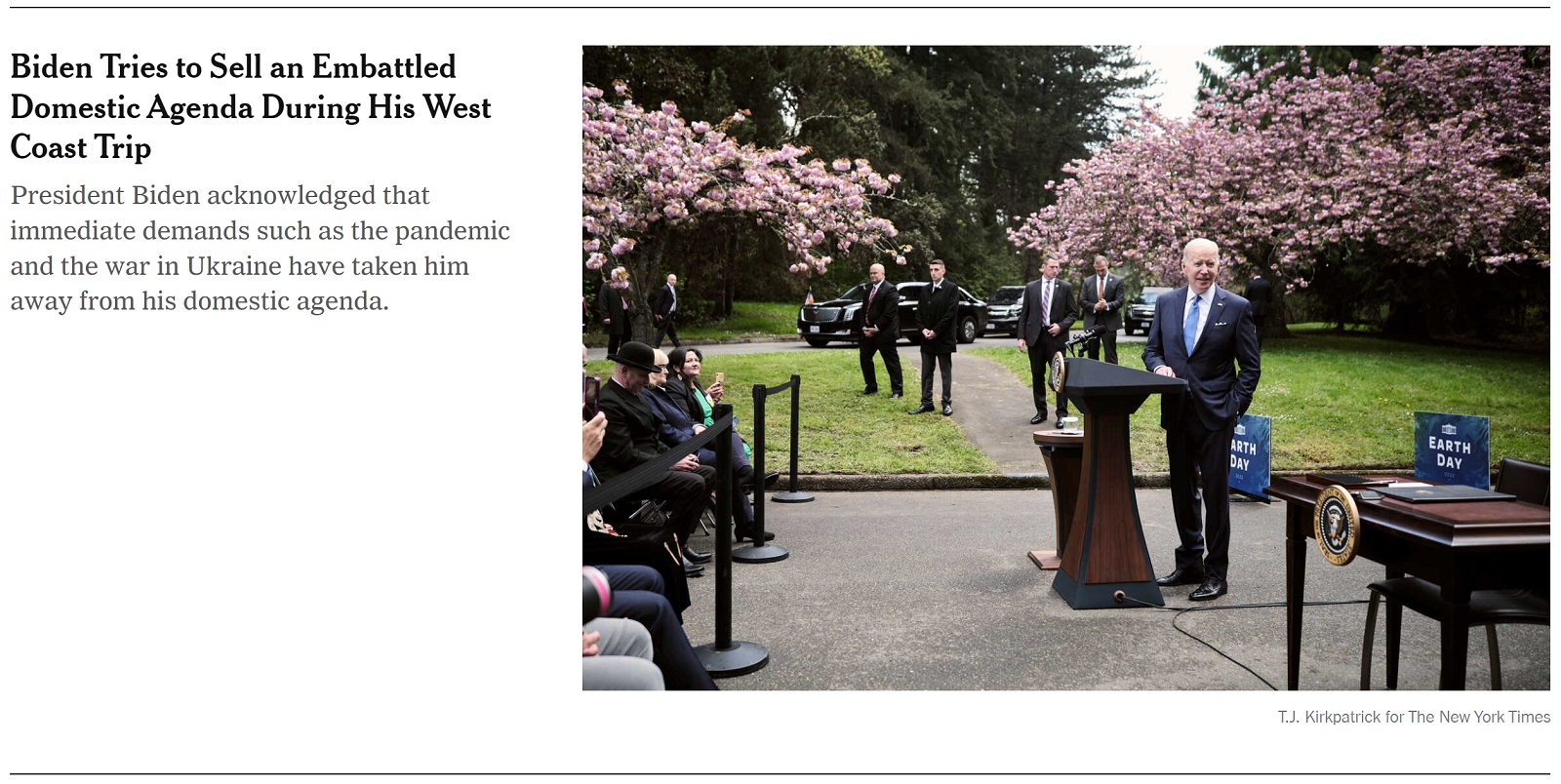 Writes Katie Rogers for the NYT: ‘He unveiled a plan to restore national forests devastated by wildfires. He promoted a climate agenda that has largely gone unfulfilled. .. The trip granted him a bit of a respite from Washington and returned him to the campaign-trail style of schmoozing that energizes him. In Seattle, Mr. Biden appeared before a group of big-ticket donors that included Brad Smith, the president of Microsoft.