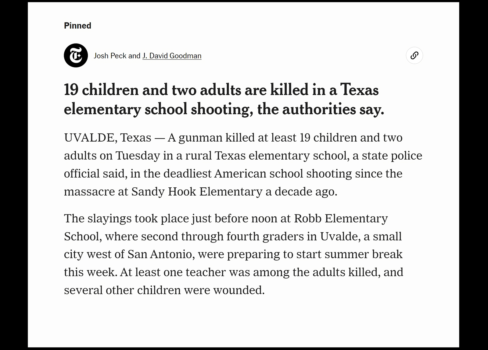 In America, mass murderers buy assault rifles legally and cheaply, and riddle you with bullets: inside the church, the grocery store, the movie theater, the bar— and the elementary school.