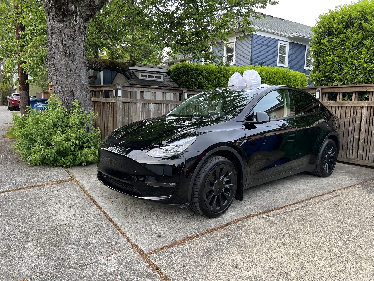 Posted on May 25, 2022May 25, 2022 by WillemWednesday/ all-black, with a big white bow There’s a brand-new Tesla Model Y on my block, complete with a giant white bow.