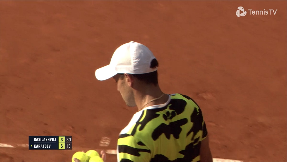 On Tuesday, Aslan Karatsev (28, from a country that shall not be named) played against Nikoloz Basilashvili (30, Georgia 🇬🇪) in Hamburg, in a wild outfit made by clothier Hydrogen from Italy.