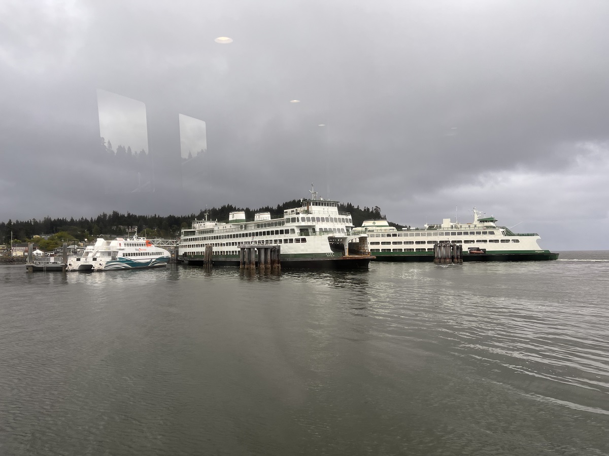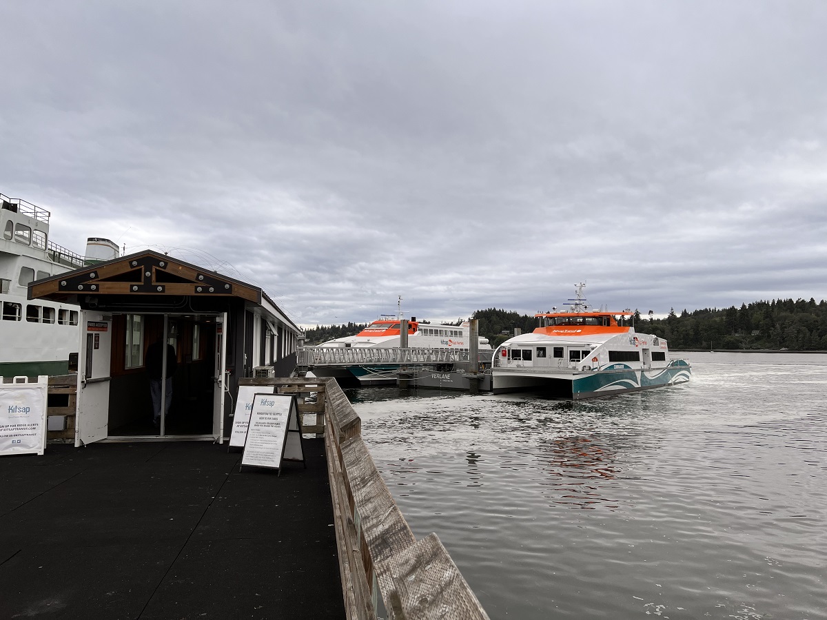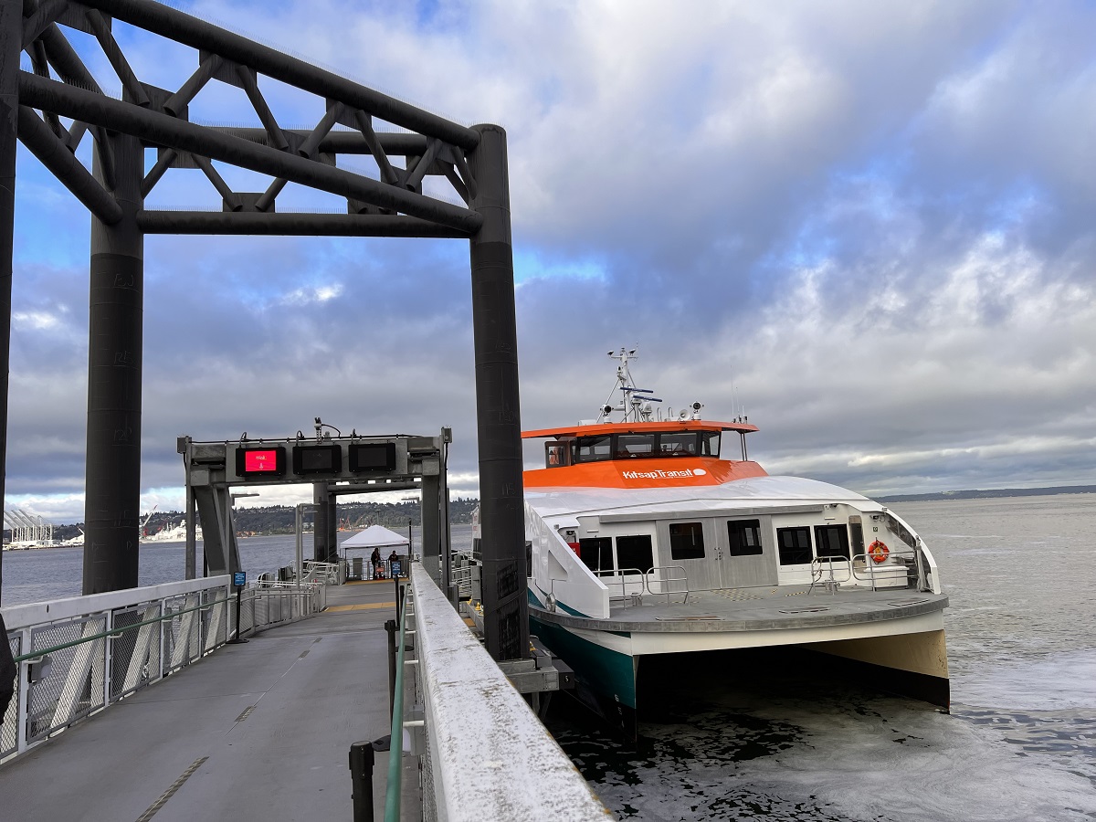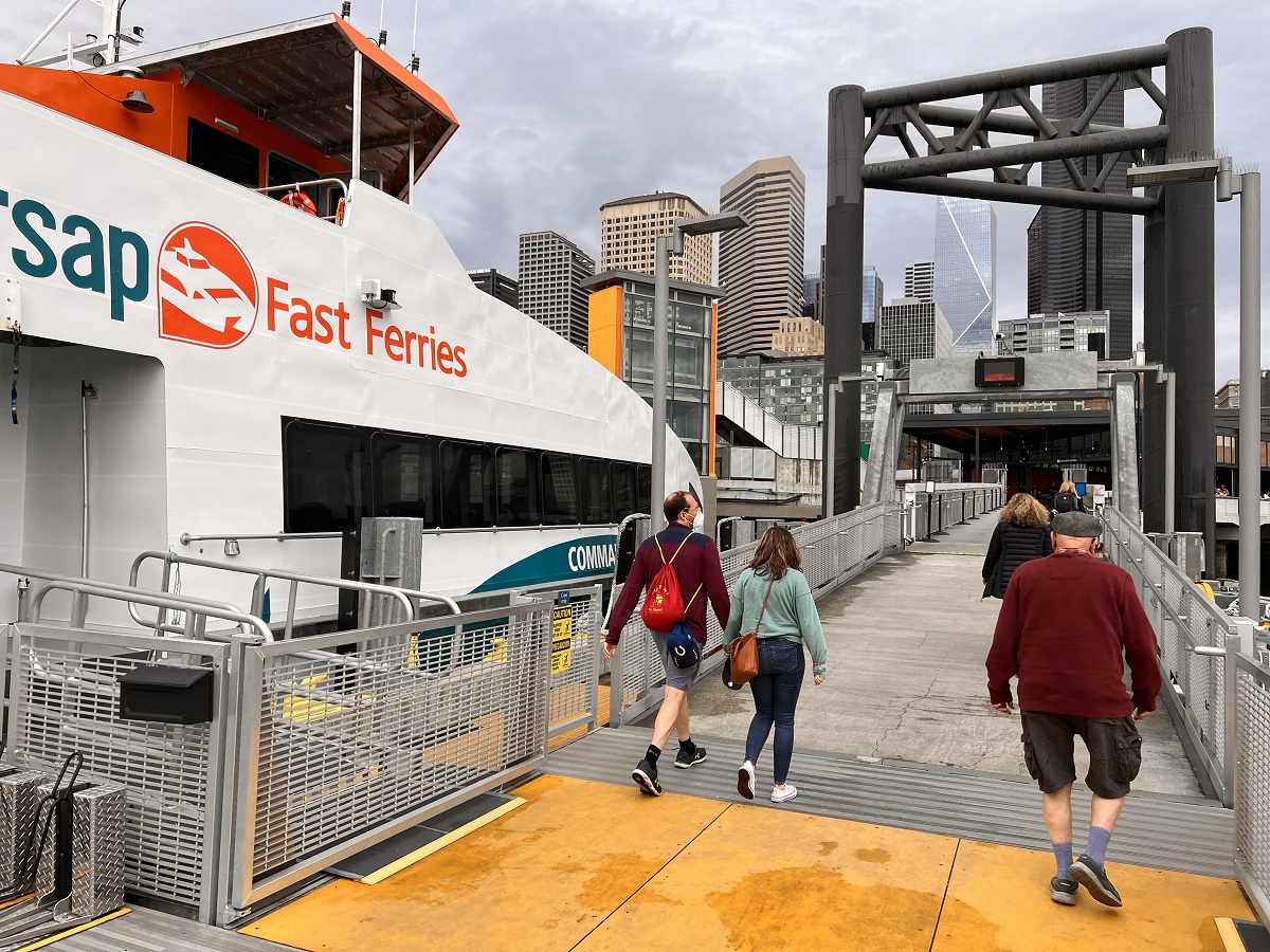Looking north along Alaskan Way from the temporary skybridge along Columbia Street. Some time in 2023 the permanent skybridge along Marion Street will be completed. Look for a plywood-encased pillar for the new skybridge in the left-of-center of the picture.The new MV (Marine Vessel) Commander at the passenger-only (no vehicles) facility at Colman dock, ready for departure. The MV Commander plies the Seattle-Kingston route with its 65-ft (20 m) aluminum catamaran hull. There are six return crossings every day, and one way takes 40 mins.There is only one level of seating inside the MV Commander, with a seating capacity of 149. It’s 7:55 am, and earlier a few dozen commuters from Kingston had arrived into Seattle. Now the empty water taxi was heading back to Kingston. Bryan and I had just boarded, and there was exactly one more passenger for this return trip back to Kingston!This is the front of the vessel, as we are pushing back from the terminal. (No, those are not flying saucers with aliens— just the reflection of the lights inside the cabin).Arriving at Kingston, 40 minutes later. On the left is the older MV Finest, built in 1996, that had been in service on the Seattle-Kingston route before being replaced with the MV Commander. In the middle is MV Hyak, constructed in 1966, and decommissioned in 2019 after 52 years of service. On the right is the MV Spokane, constructed in 1972, and providing regular ferry service for the Edmonds-Kingston route.This great blue heron (Ardea herodias) on the rocks at the Kingston ferry terminal was not cooperating for my photo, and fussing with its chest feathers instead.Entering the walkway to the MV Commander (on the right) for the return trip to Seattle.Here comes the Emerald City, the skyline bracketed by the Space Needle on the left and Smith Tower (white exterior, pyramid top) on the right. The cruise ship is the Carnival Spirit, guest capacity 2,124, getting ready to sail out to Juneau and Ketchikan, Alaska, before coming back to Seattle.The Blue Angels (F/A-18 Super Hornets) are putting in a few final practice runs for their performance for the upcoming 2022 Seafair Weekend Festival this weekend.Stepping off the MV Commander at the passenger-only terminal, Pier 50.
