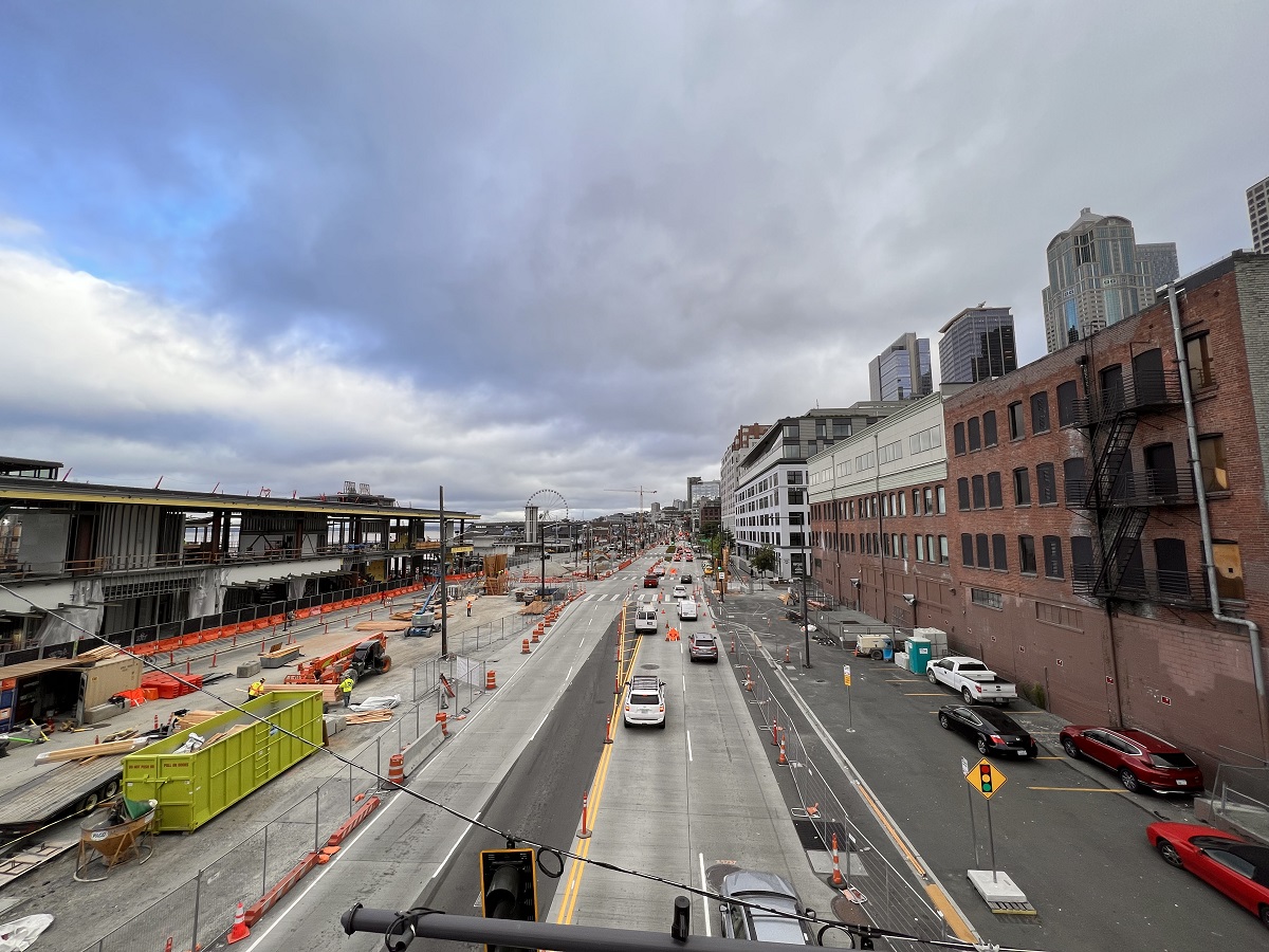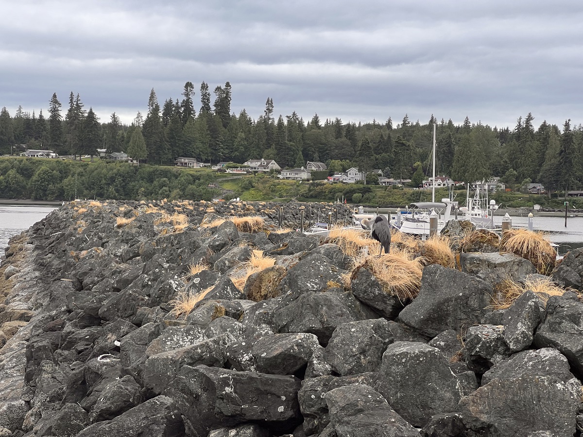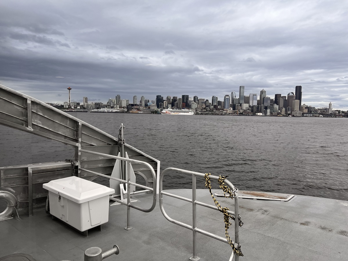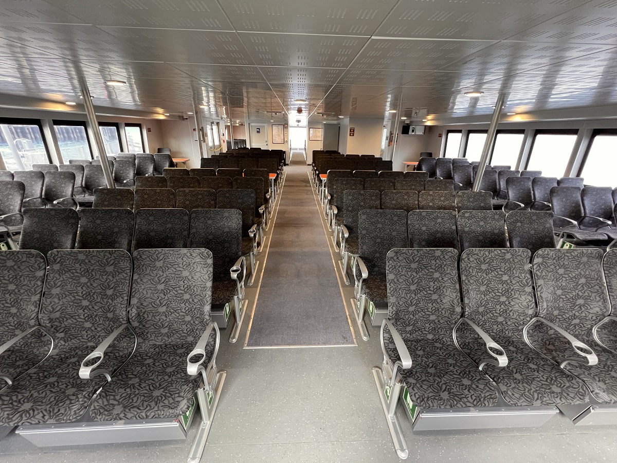 Looking north along Alaskan Way from the temporary skybridge along Columbia Street. Some time in 2023 the permanent skybridge along Marion Street will be completed. Look for a plywood-encased pillar for the new skybridge in the left-of-center of the picture.The new MV (Marine Vessel) Commander at the passenger-only (no vehicles) facility at Colman dock, ready for departure. The MV Commander plies the Seattle-Kingston route with its 65-ft (20 m) aluminum catamaran hull. There are six return crossings every day, and one way takes 40 mins.There is only one level of seating inside the MV Commander, with a seating capacity of 149. It’s 7:55 am, and earlier a few dozen commuters from Kingston had arrived into Seattle. Now the empty water taxi was heading back to Kingston. Bryan and I had just boarded, and there was exactly one more passenger for this return trip back to Kingston!This is the front of the vessel, as we are pushing back from the terminal. (No, those are not flying saucers with aliens— just the reflection of the lights inside the cabin).Arriving at Kingston, 40 minutes later. On the left is the older MV Finest, built in 1996, that had been in service on the Seattle-Kingston route before being replaced with the MV Commander. In the middle is MV Hyak, constructed in 1966, and decommissioned in 2019 after 52 years of service. On the right is the MV Spokane, constructed in 1972, and providing regular ferry service for the Edmonds-Kingston route.This great blue heron (Ardea herodias) on the rocks at the Kingston ferry terminal was not cooperating for my photo, and fussing with its chest feathers instead.Entering the walkway to the MV Commander (on the right) for the return trip to Seattle.Here comes the Emerald City, the skyline bracketed by the Space Needle on the left and Smith Tower (white exterior, pyramid top) on the right. The cruise ship is the Carnival Spirit, guest capacity 2,124, getting ready to sail out to Juneau and Ketchikan, Alaska, before coming back to Seattle.The Blue Angels (F/A-18 Super Hornets) are putting in a few final practice runs for their performance for the upcoming 2022 Seafair Weekend Festival this weekend.Stepping off the MV Commander at the passenger-only terminal, Pier 50.