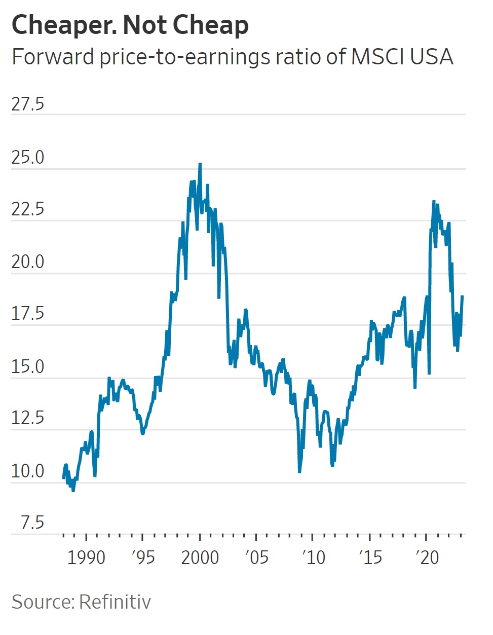 Even after their big falls, stocks still look very expensive compared to bonds. The optimism that started this year has faded, but investors continue to bet that long-run inflation will come back under control and profit margins will stay high. And many remain wary of bonds, even as yields approach 4% on the 10-year Treasury and are above 5% on six-month bills.
