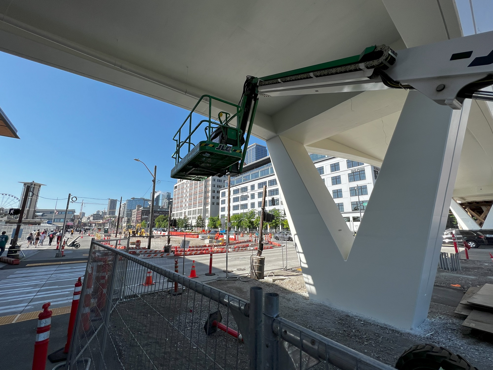 I made it to the Pike Place Market complex, on the Old Stove Brewing patio and looking south. The construction is for the Overlook Walk: an elevated public park and connection between the Waterfront to Seattle’s urban core.