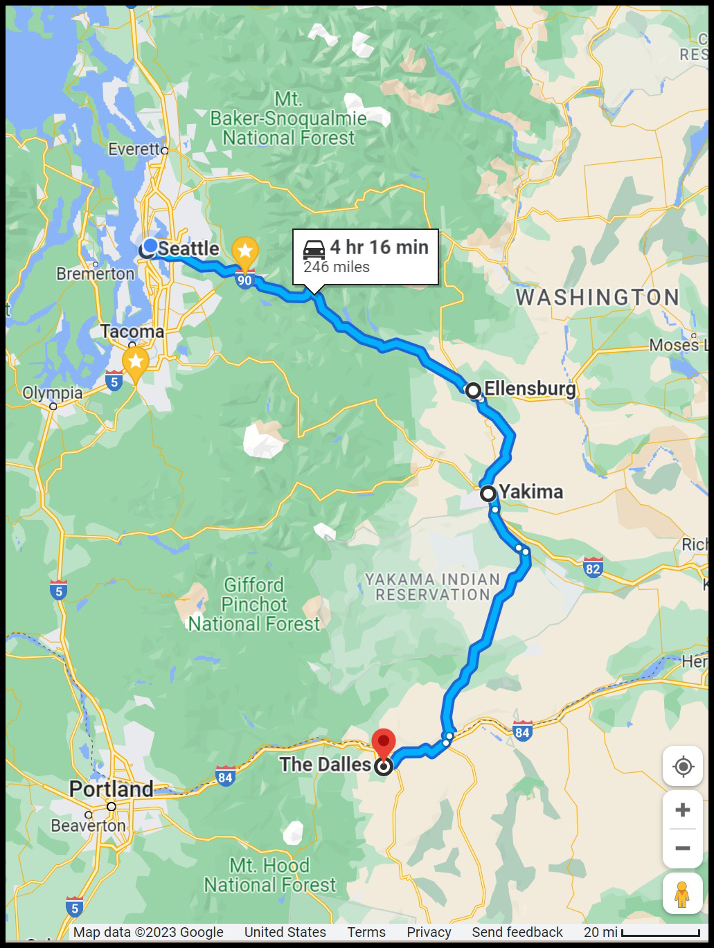 It’s over 4 hours’ driving to The Dalles— make it 5 hours, if 2 or 3 stops are made en route.