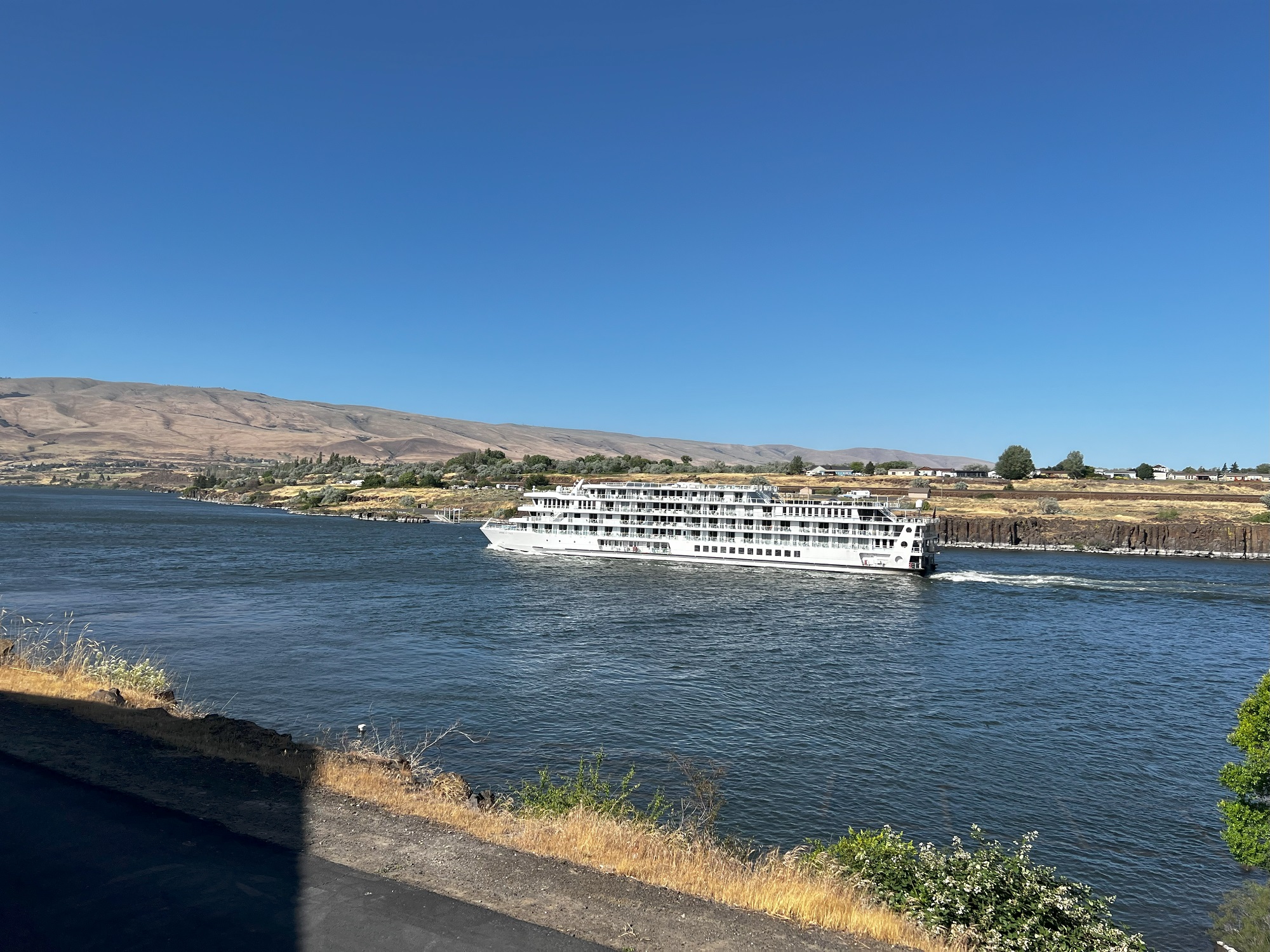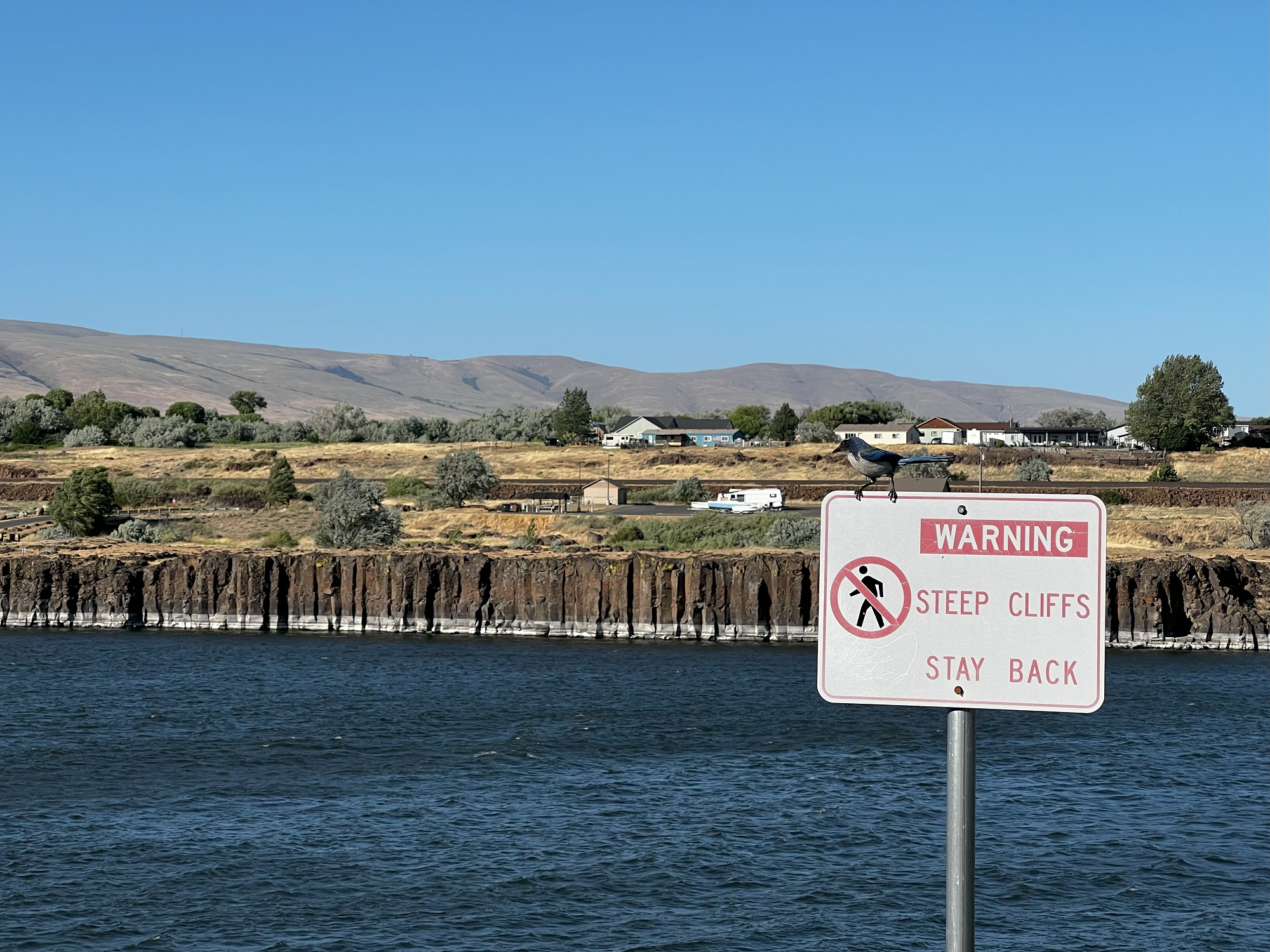 At the Yakima Tesla Supercharger off Interstate 82.The supercharger can charge at a rate of up to 250 kW. If I recall correctly— I forgot to take a screen shot of the control panel— my car’s battery was at about 50% of full charge at the start of charging, and the average charging rate achieved was 80 kW. We stayed for no more than 20 minutes, and my bill for the charging came to $13.34 ($0.44c/ kWh).The blue Tesla Model 3 and the gray Model Y (further back) made the trip to The Dalles, Oregon. There are 8 charging bays at the Yakima supercharger station.Our lodging for the overnight stay: Cousin’s Country Inn in The Dalles, Oregon.A giant weather vane at the entrance of Bargeway Pub on the banks of the Columbia River in The Dalles, Oregon.Hollyhocks (Alcea rosea) in the flower garden by the entrance of Bargeway Pub.The patio at the Bargeway Pub offers a panoramic view of the mighty Columbia River. That’s Washington State on the other side. The ship is the American Jazz* from river cruise ship operator American Cruise Lines, making her way to Portland, Oregon. *Built in 2020 by Chesapeake Shipbuilding (Salisbury, Maryland, USA) for US$45m. She has 6 decks and 99 cabins.A view of the cliffs on the opposing river bank. Look for the blue jay perched on the sign.