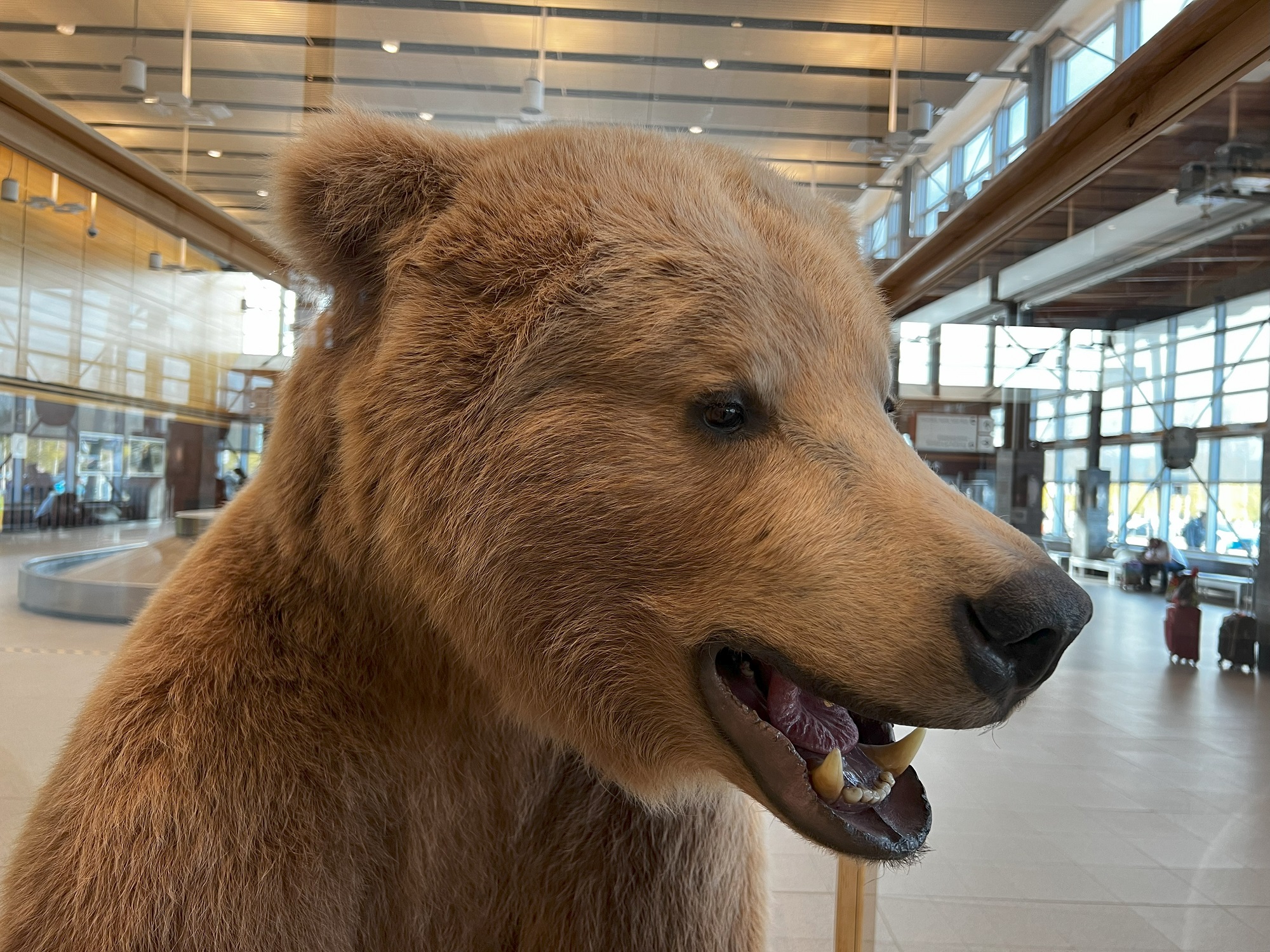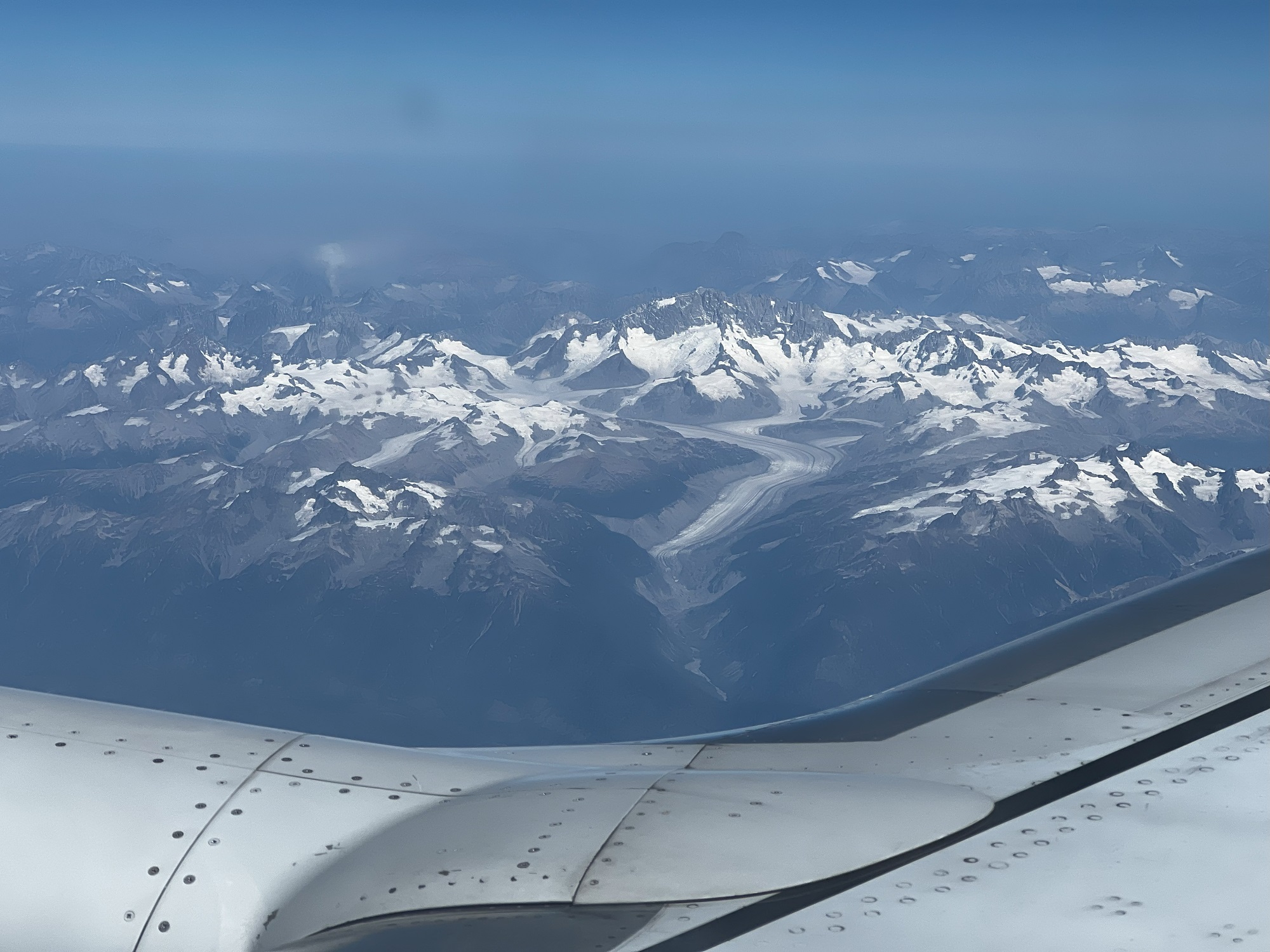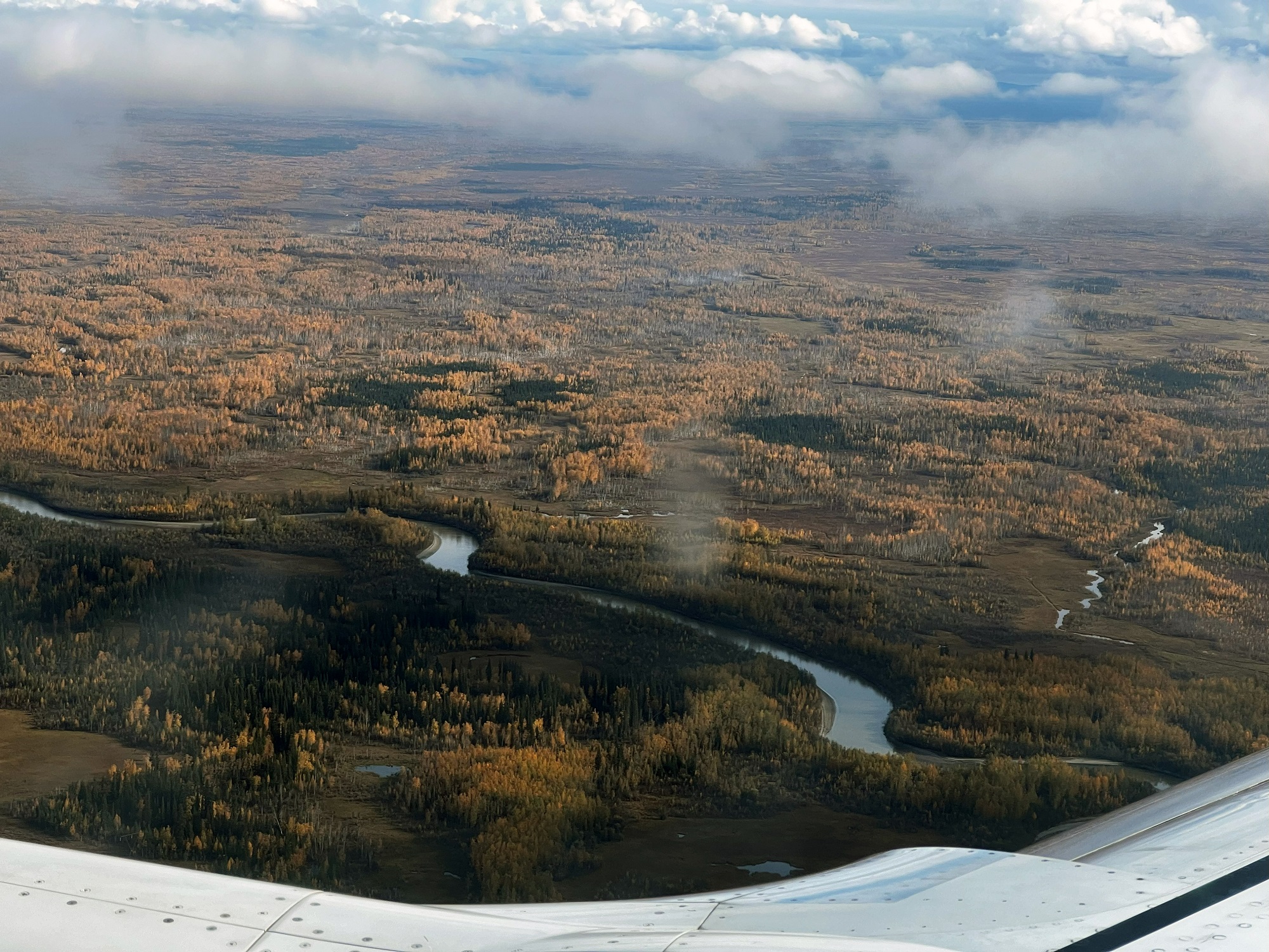 Top to bottom: Stepping on board in Seattle; a glacier somewhere over Canada; approaching Fairbanks— and noticing fall’s colors in the woods; a bear at Fairbanks airport; the view from our rented cottage, some 15 miles outside Fairbanks.