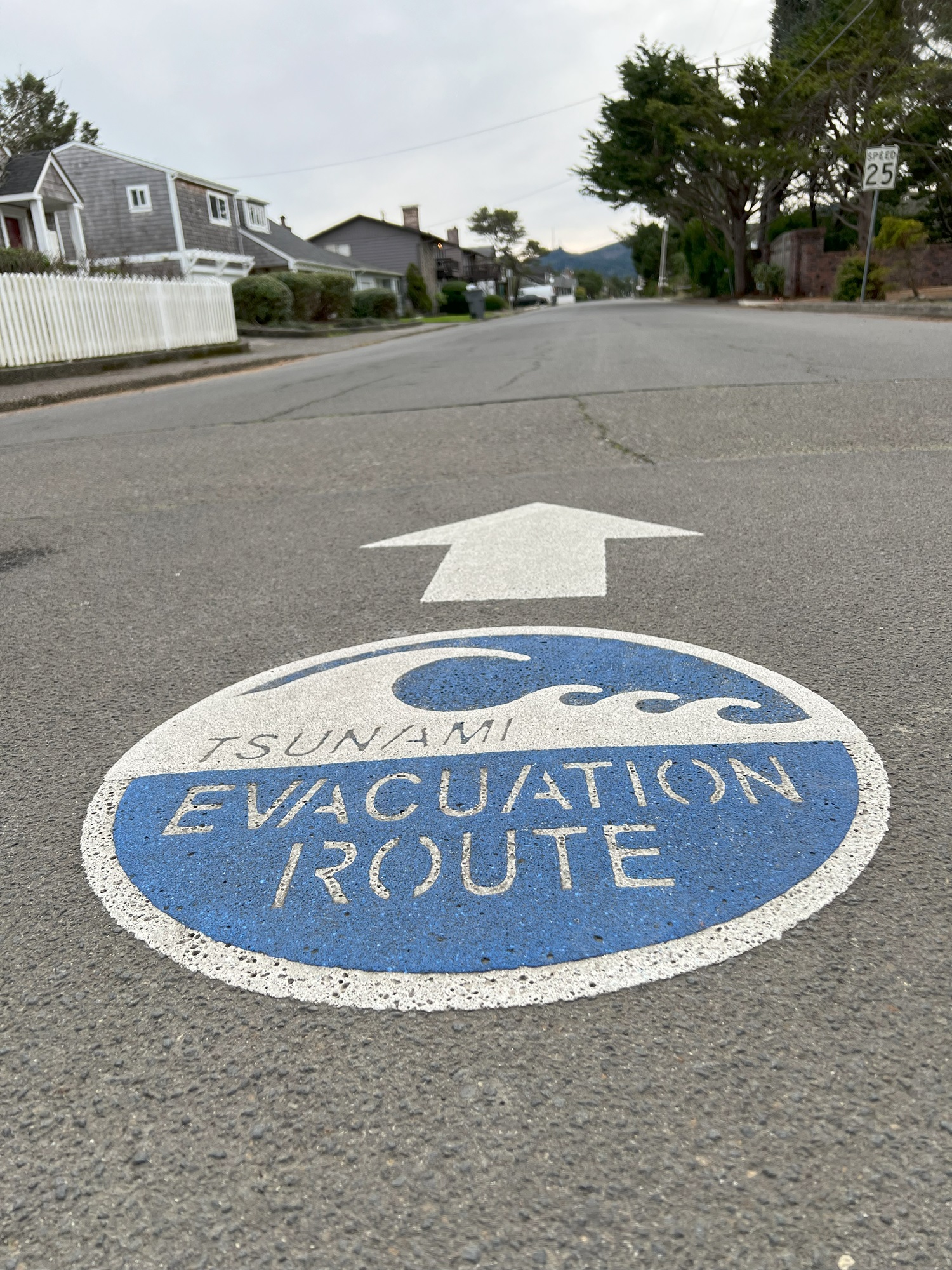 Seaside beach around noon on Wednesday | The historic Seaside Promenade is 1½ miles long and was dedicated in 1921 | Monument for Lewis and Clark, whose expedition had started in St Louis, MO, in May 1804, and ended at Fort Clatsop in Sept. 1806, nearby Seaside, to its north | A marker for an evacuation route (Seaside is only at 23′ elevation and vulnerable to tsunamis) | Approaching the drawbridge on US-101 going over Youngs River