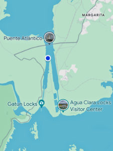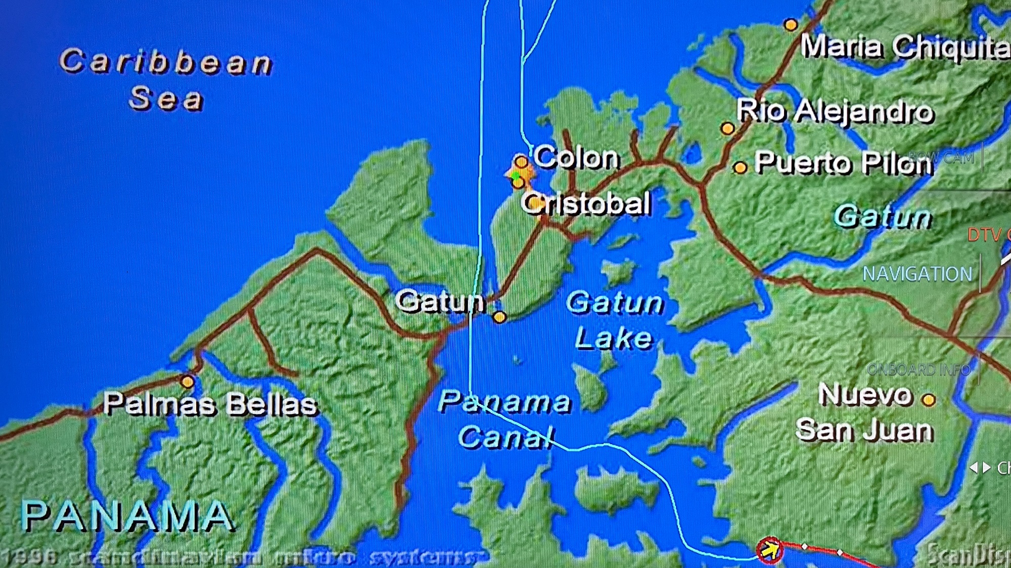 The Norwegian Sun’s position at 4.38 pm this afternoon: leaving Gatun Lake to enter the Miraflores Locks. [Image: The ship’s navigation TV channel]We traversed the engineering marvel called the Panama Canal today.
