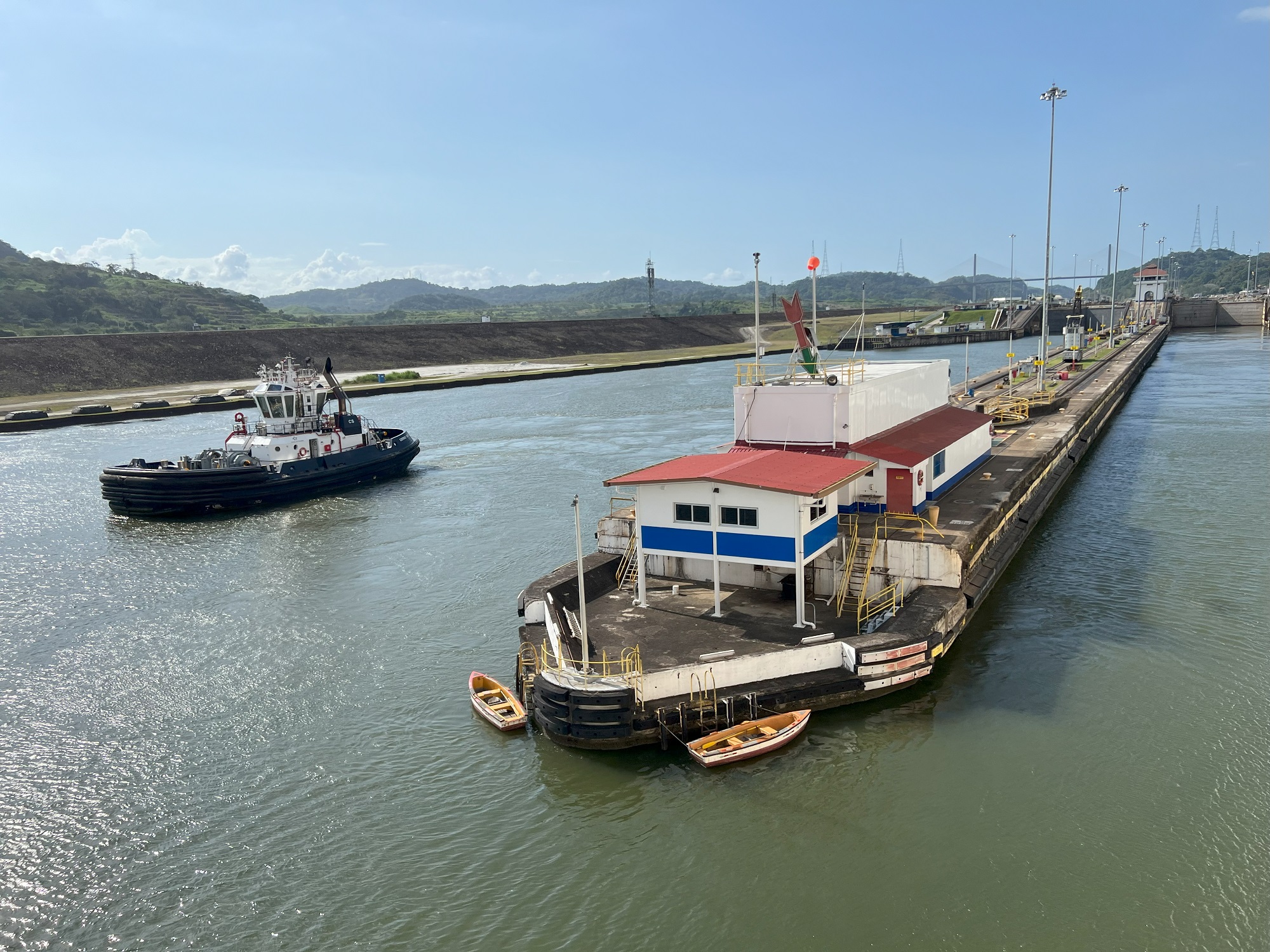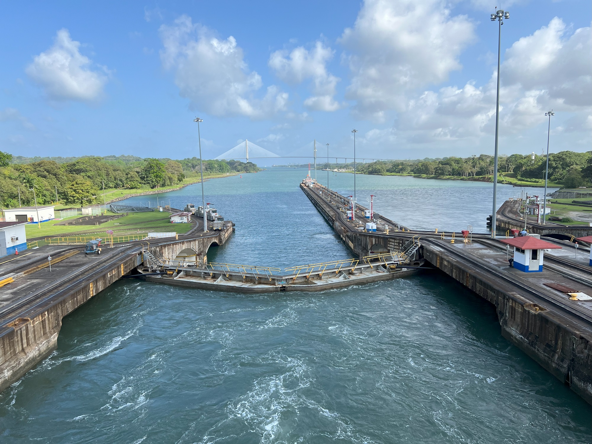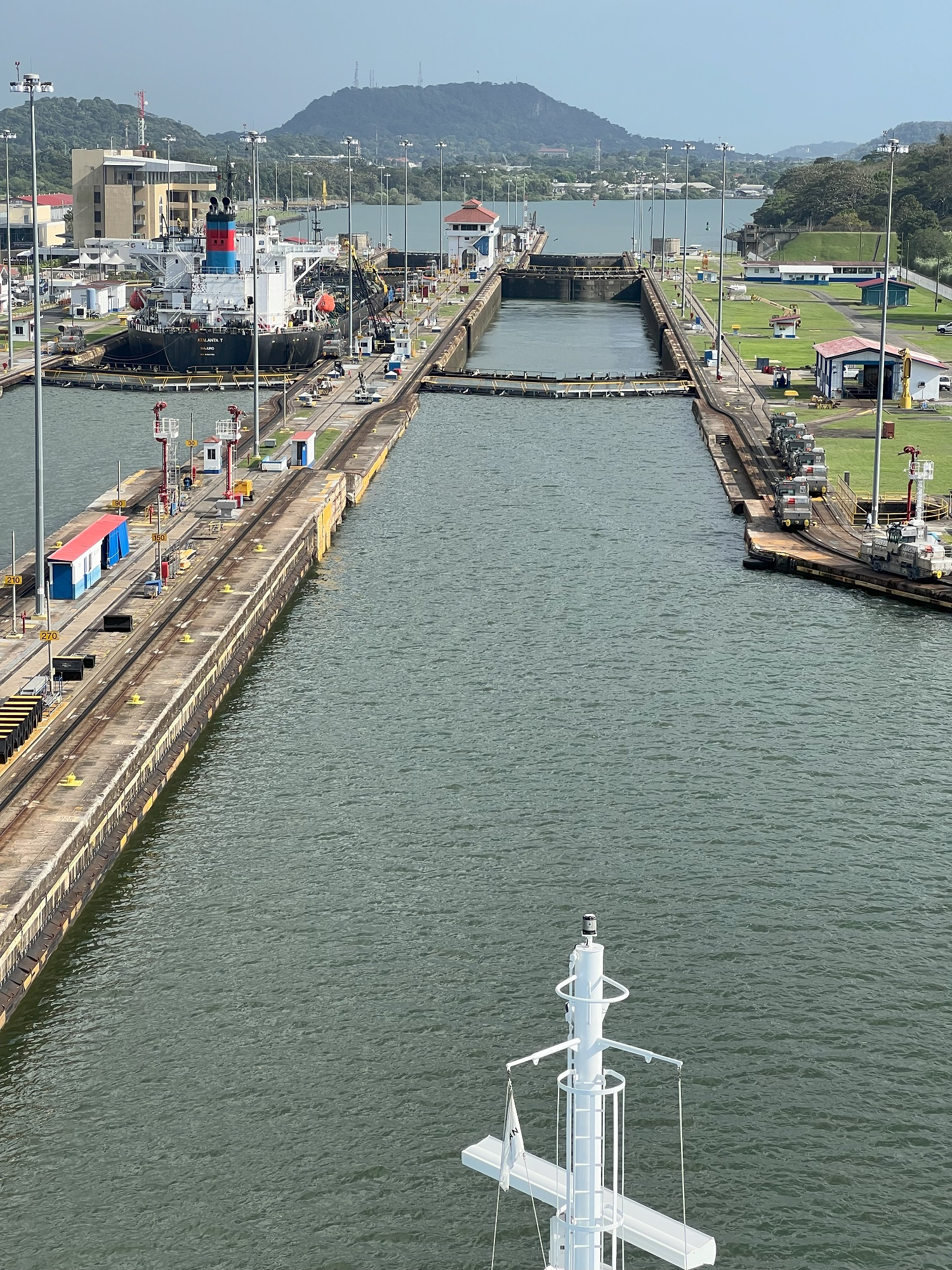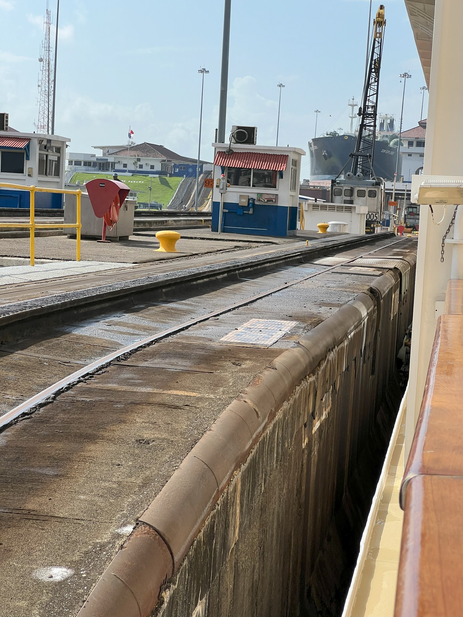 Atlantic Bridge (Puente Atlántico), the new 15,092 ft (4,600 m) suspension bridge completed in 2019.Entering the Gatun Locks. The newer, wider Agua Clara Locks to the right were completed in 2016.Approaching the Gatun Locks. Will she be able to squeeze in? (Yes.)Entering the Gatun Locks.No, we’re not on dry land— still floating but inside the lock. Another ‘Panamax’ size* vessel is coming through in the opposite direction. *The Panamax dimensions give clear parameters for ships destined to traverse the Panama Canal and have influenced the design of cargo ships, naval vessels, and passenger ships.Gatun Lake lies 85 ft (25.9 m) above sea level, and here comes the second (of three) Gatun locks that will raise the ship. Look for the mule on the right edge of the picture. These are powerful electric locomotives that run on paired 5 ft (1,524 mm) broad gauge railway tracks, tethered to the ship on both sides with cables, to guide it through the locks.Now Norwegian Sun is inside the lock, with the gates in front of her bow closed, and this one at her stern as well. (Looking back at the Atlantic Bridge in the distance). The lock is about to be filled with water to raise her up.Getting there ..The lock is filled, and the one at the front of the ship has been opened. We have started to move forward, into the next lock.A view of how the mule on the tracks is attached to a vessel.There is very, very little room to spare between the hull of Norwegian Sun and the walls of the lock.Tight. Very tight. I am not sure what this gap in inches is, but it seems to be less than a foot. Another look back as we leave the first of the Gatun Locks.Now out of the Gatun Locks, and on the large and sprawling Gatun Lake. More than a dozen crew from Norwegian Sun stepped onto this boat alongside Norwegian Sun.Crossing Gatun Lake. This is the area that we looked down onto yesterday, from the observation tower that we had reached with the Gamboa Aerial Tramway nearby.Approaching the Centennial Bridge (Spanish: Puente Centenario) that was completed in 2004.Inside the Pedro Miguel Locks, the first of the locks that will lower the Norwegian Sun back to sea level.Leaving the Pedro Miguel Locks.Approaching the Miraflores Locks.Approaching the two locks called the Miraflores Locks.Another tight fit: inside the Miraflores Locks.Sunset— our first one over the Atlantic Ocean.