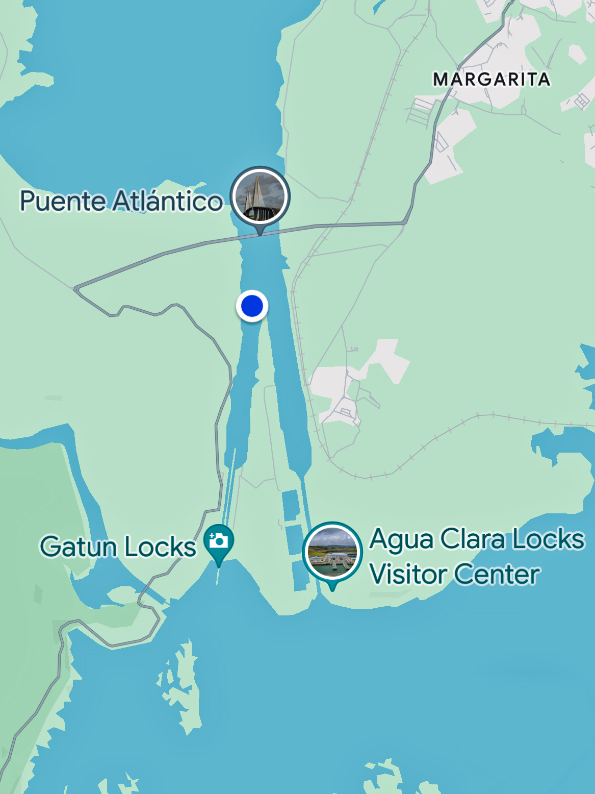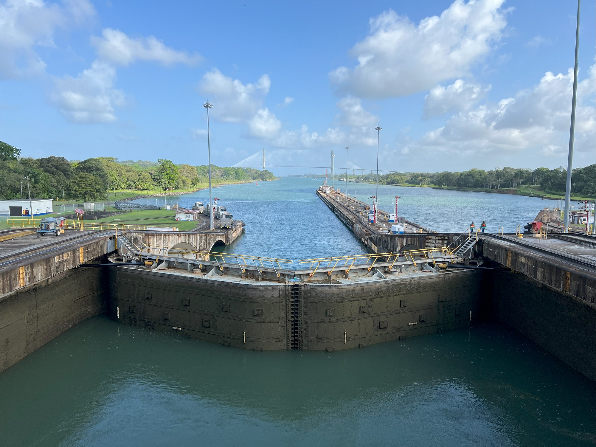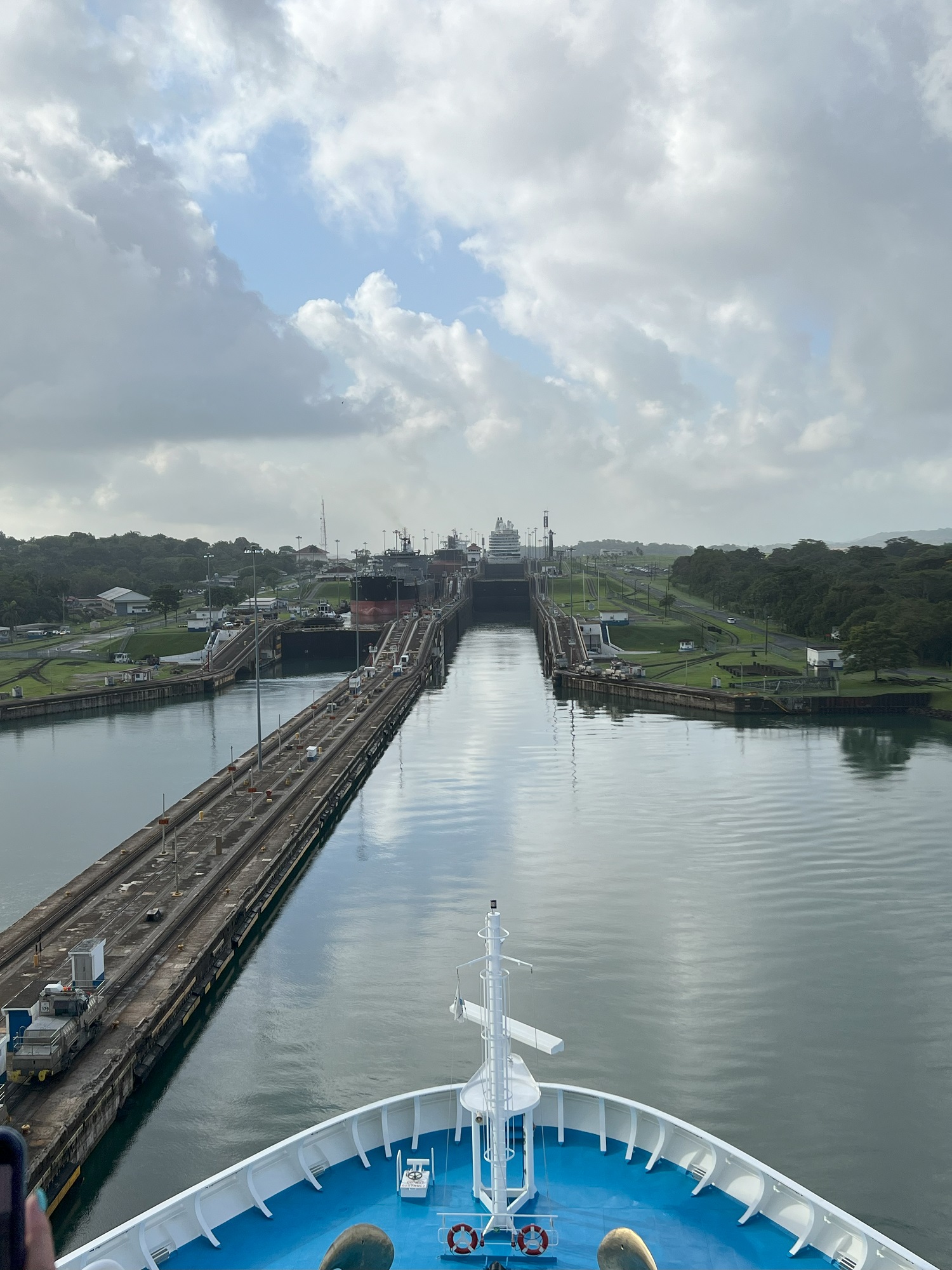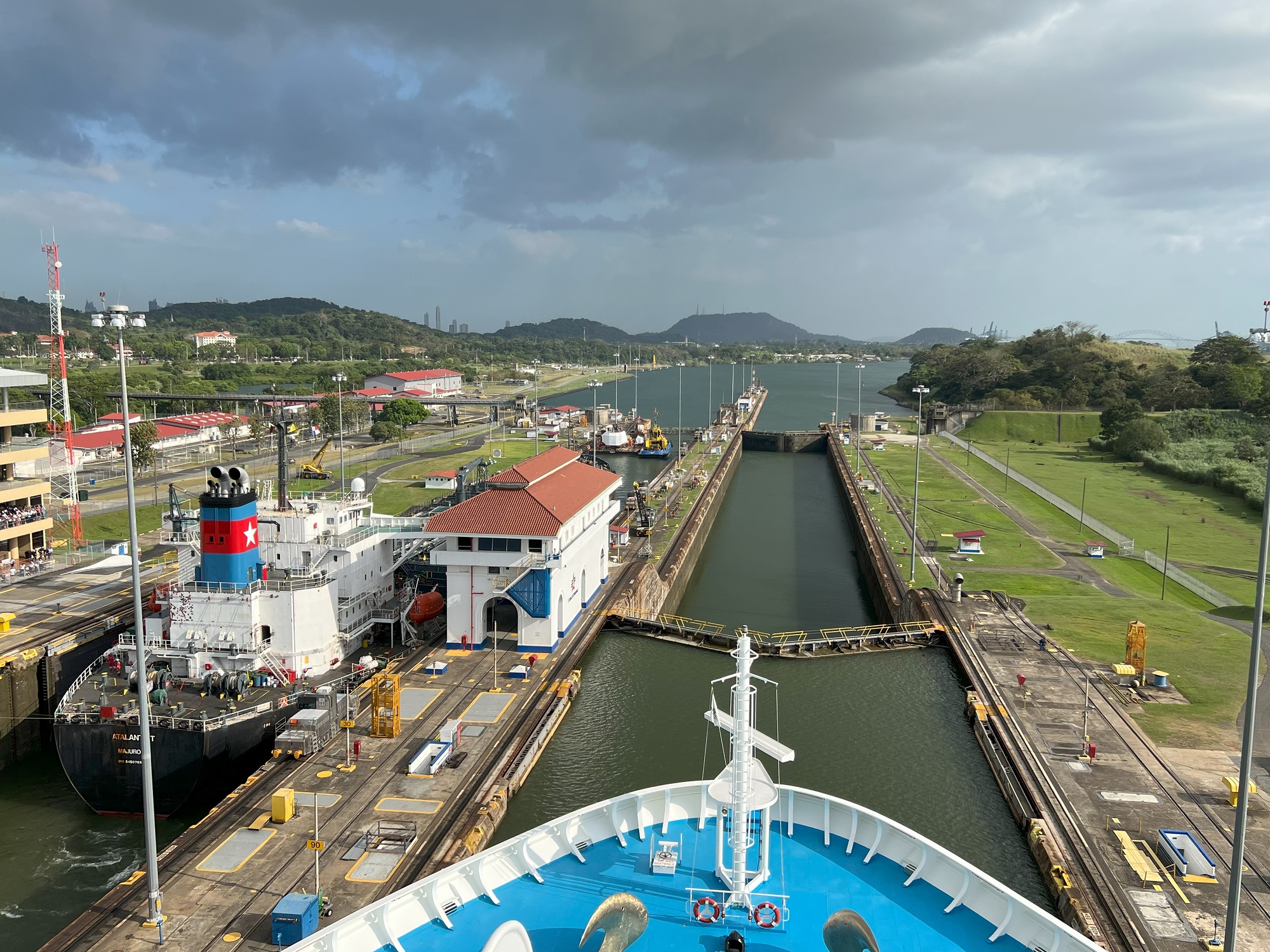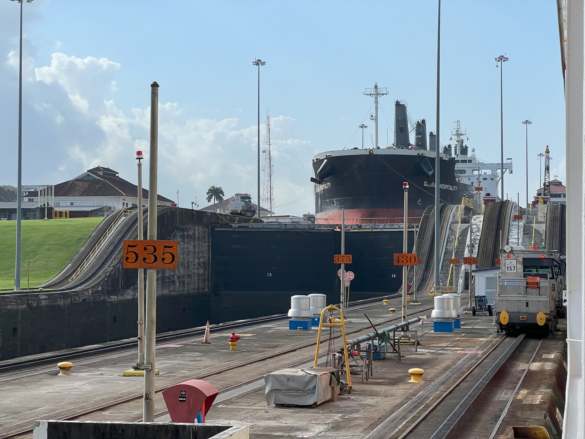 Atlantic Bridge (Puente Atlántico), the new 15,092 ft (4,600 m) suspension bridge completed in 2019.Entering the Gatun Locks. The newer, wider Agua Clara Locks to the right were completed in 2016.Approaching the Gatun Locks. Will she be able to squeeze in? (Yes.)Entering the Gatun Locks.No, we’re not on dry land— still floating but inside the lock. Another ‘Panamax’ size* vessel is coming through in the opposite direction. *The Panamax dimensions give clear parameters for ships destined to traverse the Panama Canal and have influenced the design of cargo ships, naval vessels, and passenger ships.Gatun Lake lies 85 ft (25.9 m) above sea level, and here comes the second (of three) Gatun locks that will raise the ship. Look for the mule on the right edge of the picture. These are powerful electric locomotives that run on paired 5 ft (1,524 mm) broad gauge railway tracks, tethered to the ship on both sides with cables, to guide it through the locks.Now Norwegian Sun is inside the lock, with the gates in front of her bow closed, and this one at her stern as well. (Looking back at the Atlantic Bridge in the distance). The lock is about to be filled with water to raise her up.Getting there ..The lock is filled, and the one at the front of the ship has been opened. We have started to move forward, into the next lock.A view of how the mule on the tracks is attached to a vessel.There is very, very little room to spare between the hull of Norwegian Sun and the walls of the lock.Tight. Very tight. I am not sure what this gap in inches is, but it seems to be less than a foot. Another look back as we leave the first of the Gatun Locks.Now out of the Gatun Locks, and on the large and sprawling Gatun Lake. More than a dozen crew from Norwegian Sun stepped onto this boat alongside Norwegian Sun.Crossing Gatun Lake. This is the area that we looked down onto yesterday, from the observation tower that we had reached with the Gamboa Aerial Tramway nearby.Approaching the Centennial Bridge (Spanish: Puente Centenario) that was completed in 2004.Inside the Pedro Miguel Locks, the first of the locks that will lower the Norwegian Sun back to sea level.Leaving the Pedro Miguel Locks.Approaching the Miraflores Locks.Approaching the two locks called the Miraflores Locks.Another tight fit: inside the Miraflores Locks.Sunset— our first one over the Atlantic Ocean.