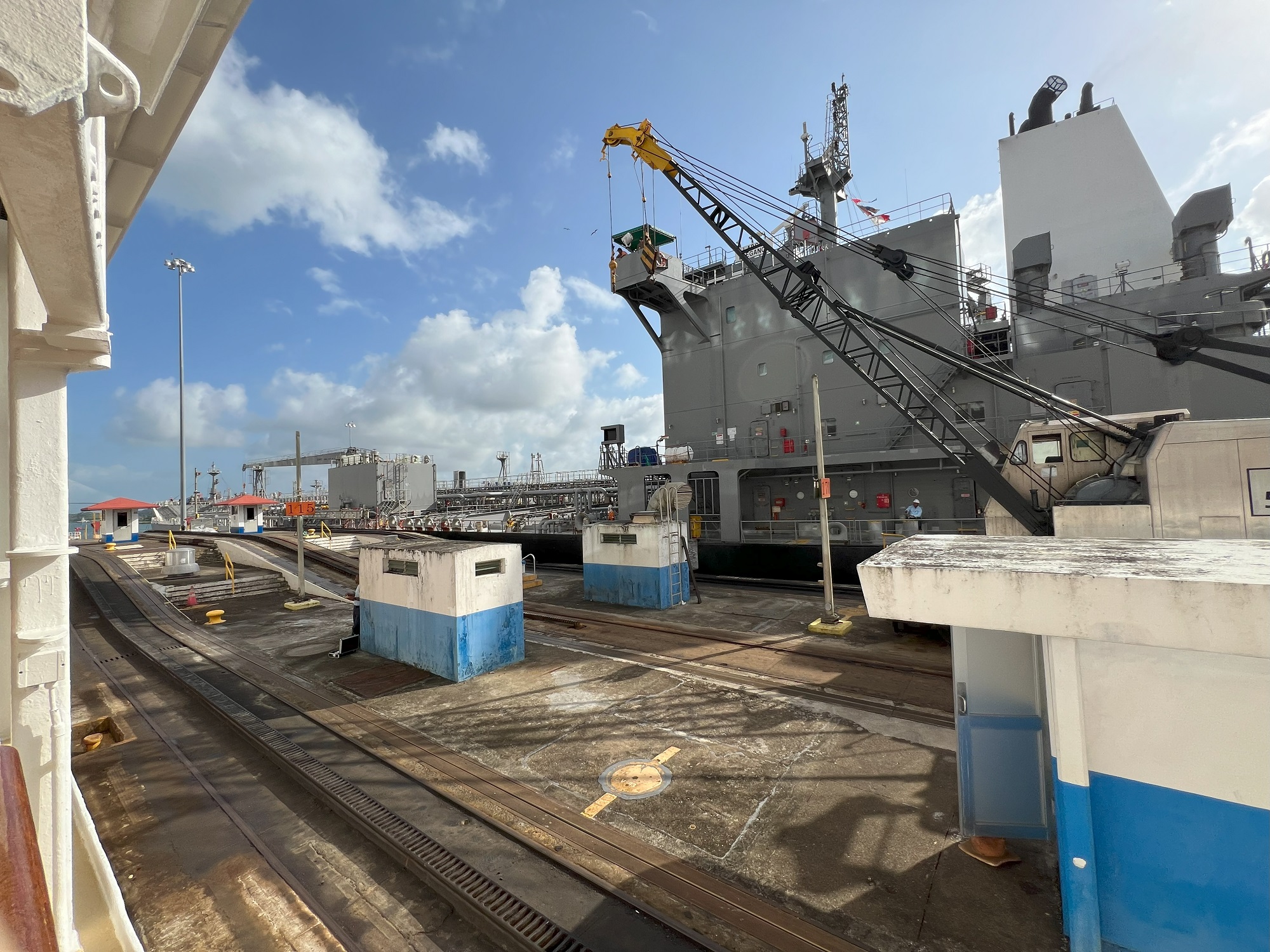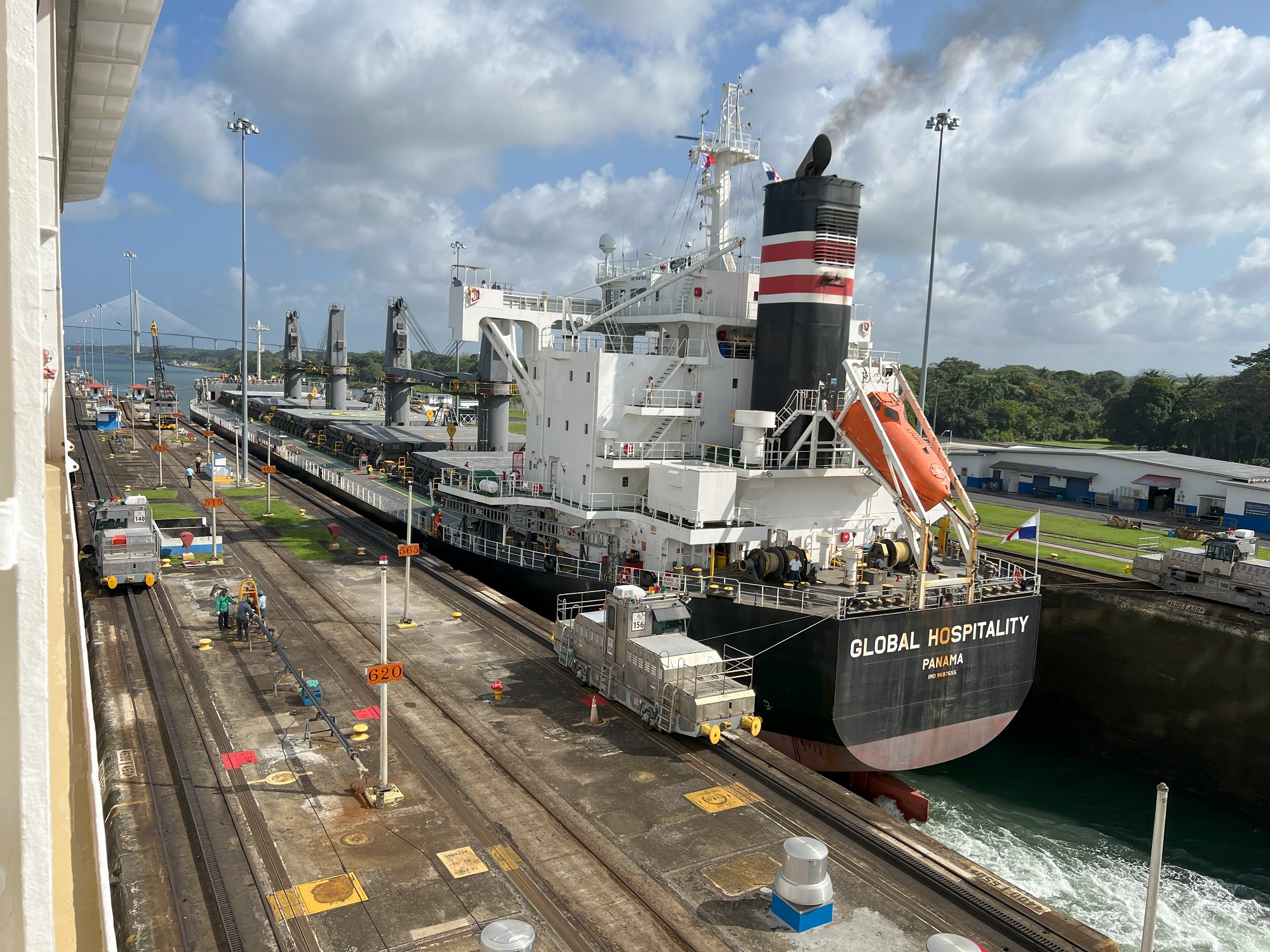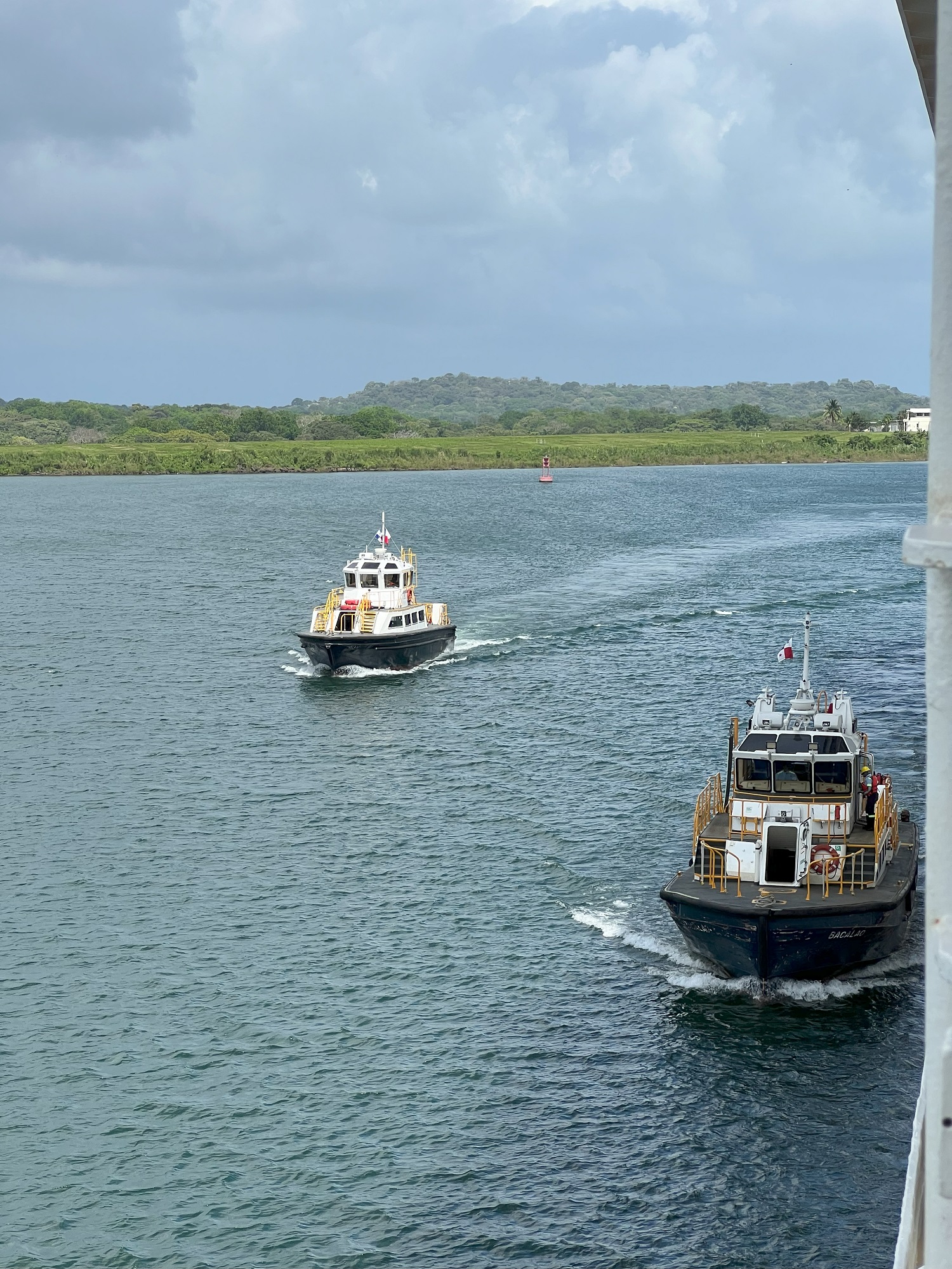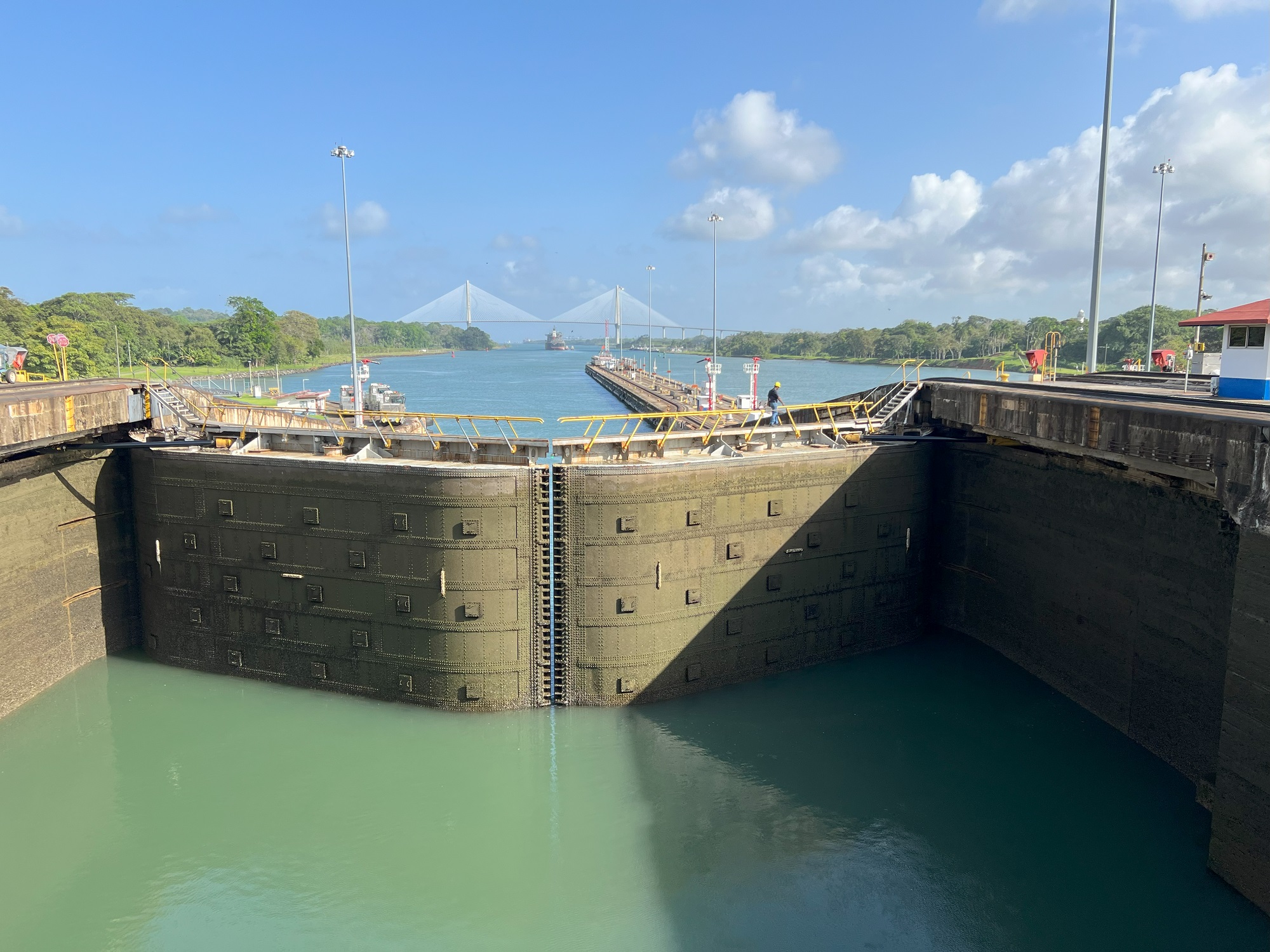 Atlantic Bridge (Puente Atlántico), the new 15,092 ft (4,600 m) suspension bridge completed in 2019.Entering the Gatun Locks. The newer, wider Agua Clara Locks to the right were completed in 2016.Approaching the Gatun Locks. Will she be able to squeeze in? (Yes.)Entering the Gatun Locks.No, we’re not on dry land— still floating but inside the lock. Another ‘Panamax’ size* vessel is coming through in the opposite direction. *The Panamax dimensions give clear parameters for ships destined to traverse the Panama Canal and have influenced the design of cargo ships, naval vessels, and passenger ships.Gatun Lake lies 85 ft (25.9 m) above sea level, and here comes the second (of three) Gatun locks that will raise the ship. Look for the mule on the right edge of the picture. These are powerful electric locomotives that run on paired 5 ft (1,524 mm) broad gauge railway tracks, tethered to the ship on both sides with cables, to guide it through the locks.Now Norwegian Sun is inside the lock, with the gates in front of her bow closed, and this one at her stern as well. (Looking back at the Atlantic Bridge in the distance). The lock is about to be filled with water to raise her up.Getting there ..The lock is filled, and the one at the front of the ship has been opened. We have started to move forward, into the next lock.A view of how the mule on the tracks is attached to a vessel.There is very, very little room to spare between the hull of Norwegian Sun and the walls of the lock.Tight. Very tight. I am not sure what this gap in inches is, but it seems to be less than a foot. Another look back as we leave the first of the Gatun Locks.Now out of the Gatun Locks, and on the large and sprawling Gatun Lake. More than a dozen crew from Norwegian Sun stepped onto this boat alongside Norwegian Sun.Crossing Gatun Lake. This is the area that we looked down onto yesterday, from the observation tower that we had reached with the Gamboa Aerial Tramway nearby.Approaching the Centennial Bridge (Spanish: Puente Centenario) that was completed in 2004.Inside the Pedro Miguel Locks, the first of the locks that will lower the Norwegian Sun back to sea level.Leaving the Pedro Miguel Locks.Approaching the Miraflores Locks.Approaching the two locks called the Miraflores Locks.Another tight fit: inside the Miraflores Locks.Sunset— our first one over the Atlantic Ocean.