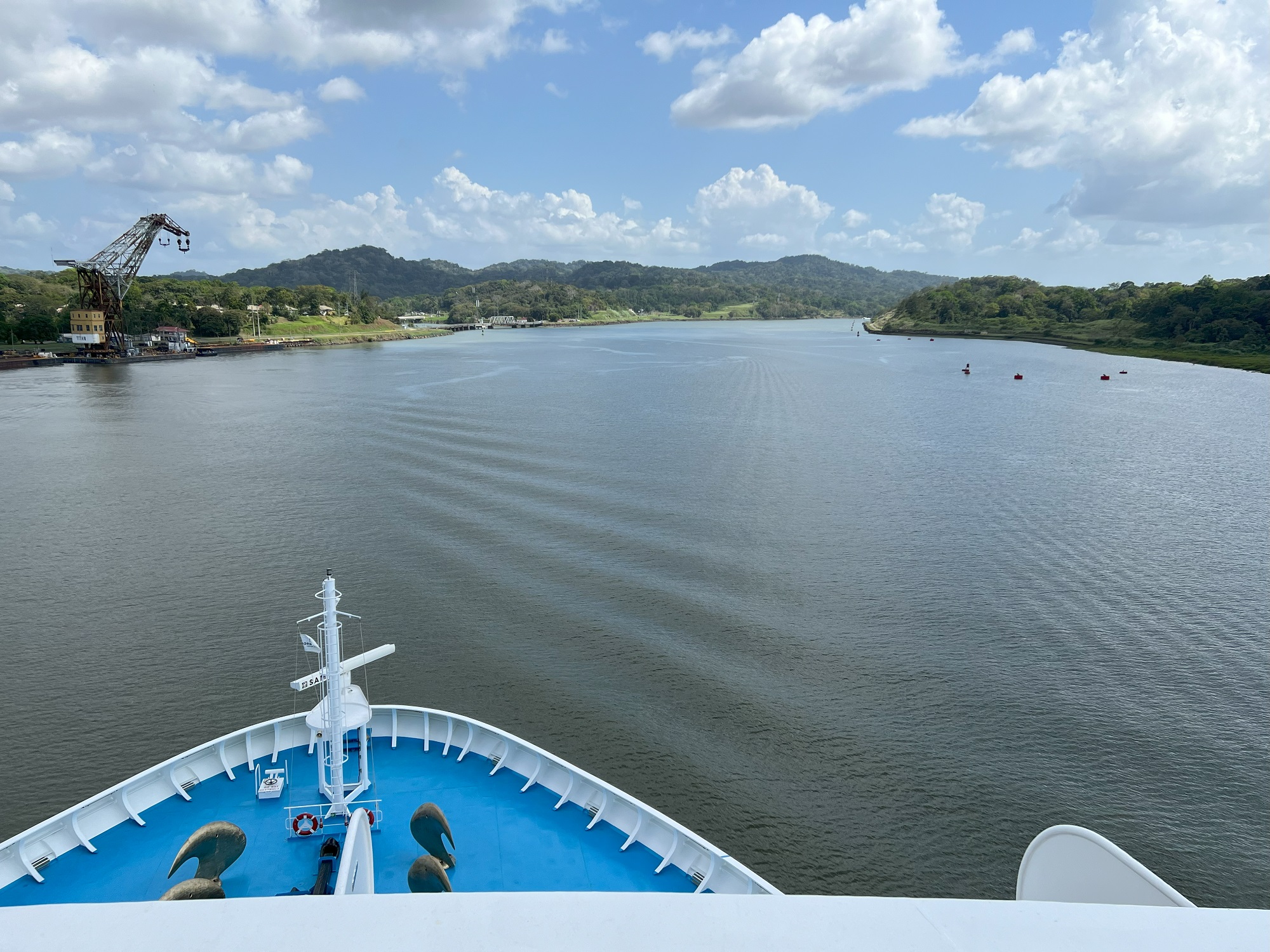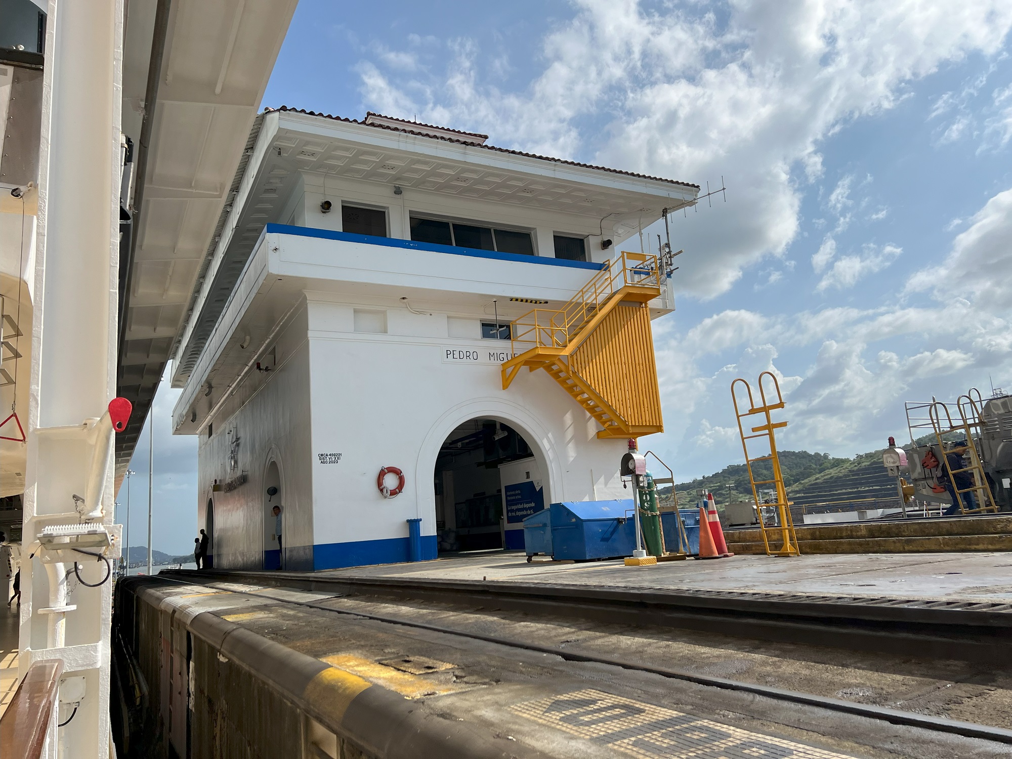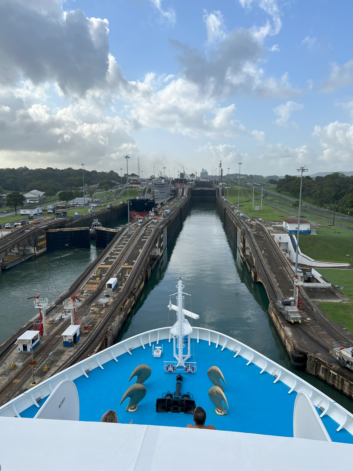 Soon after that it was time to enter the Pedro Miguel Locks and the Miraflores Locks. These locks lowered the Norwegian Sun to the level of the Atlantic Ocean— the ocean that used to be a continent away from the Pacific, and not a mere 51 miles (82 km).