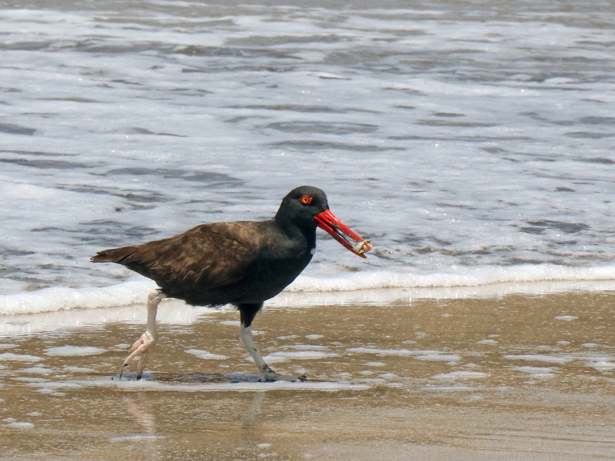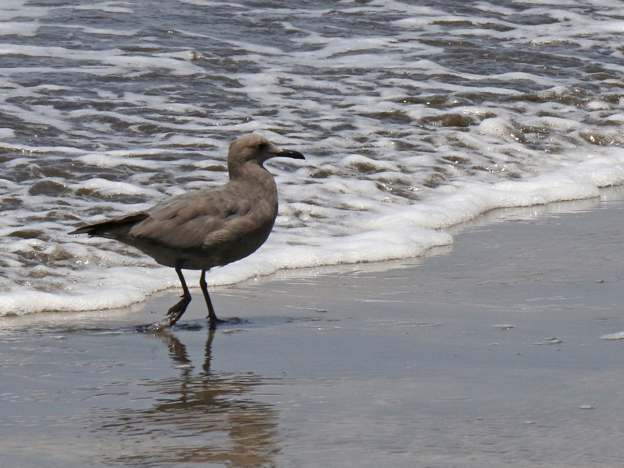 The blackish oystercatcher is a species of wading bird in the oystercatcher family Haematopodidae. It is found in Argentina, Chile, the Falkland Islands and Peru, and is a vagrant to Uruguay. [Wikipedia] I caught this one digging a little crab out of the sand at the edge of the surf.The grey gull, also known as garuma gull, is a medium-sized gull native to South America. Unusual among gulls, it breeds inland in the extremely dry Atacama Desert in northern Chile, although it is present as a non-breeding bird along much of the Pacific coast of South America. [Wikipedia]