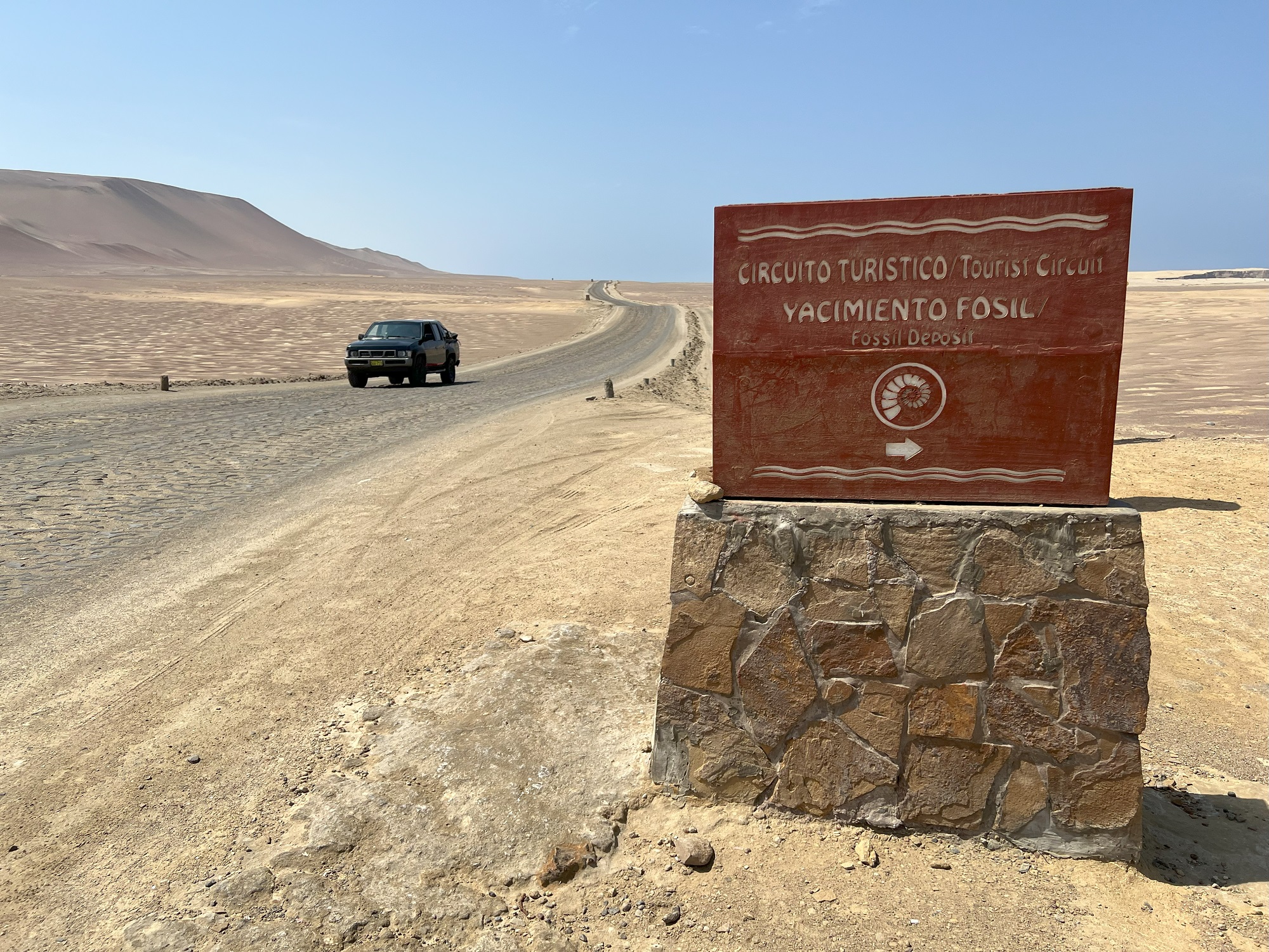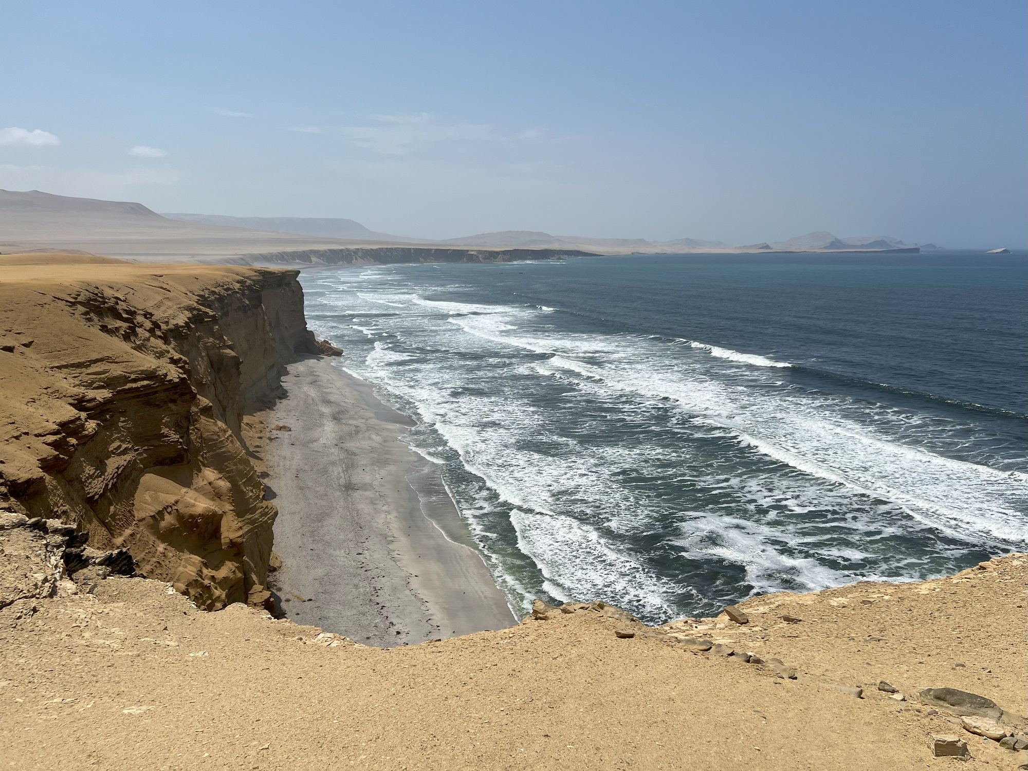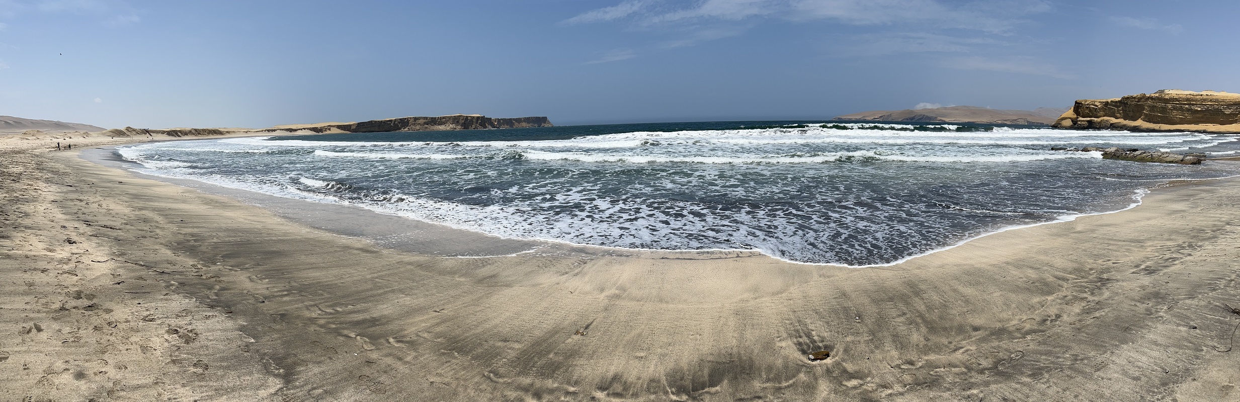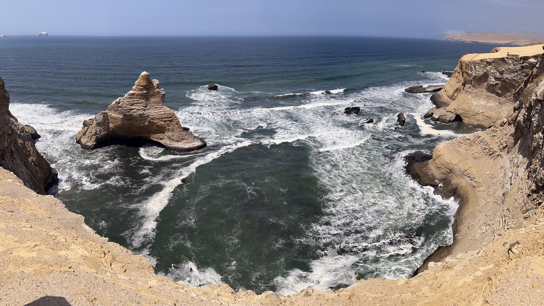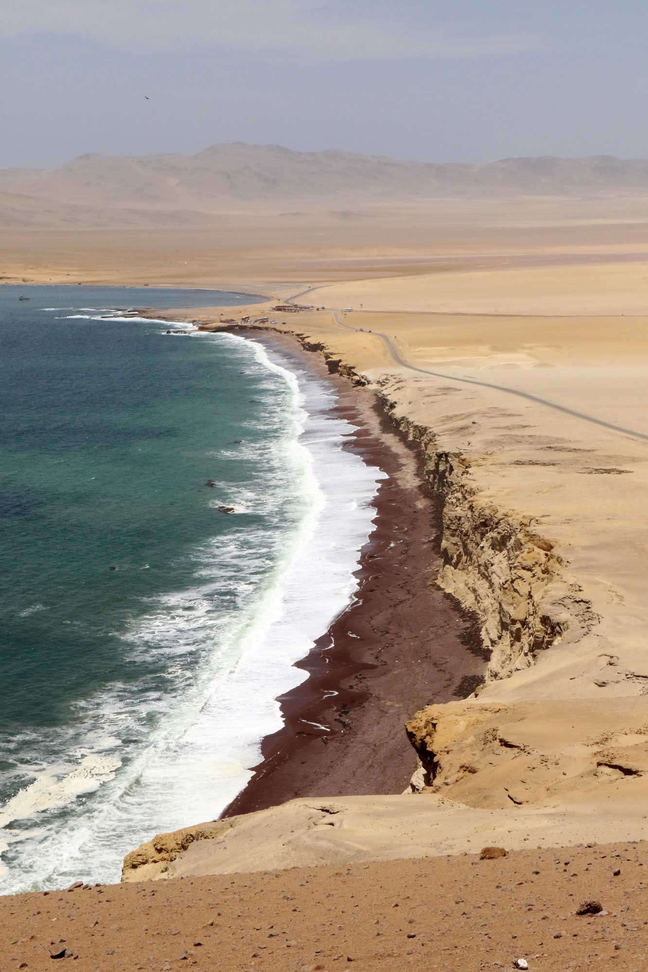 At our first stop there was a trail with an overlook to Supay Beach.Please do not collect fossils (of shells imbedded in stones).Here is Supay Beach.The rocky outcrop on the left full of seabirds and guano is called La Cátedral (The Cathedral).This stop in Paracas National Reserve provided a great view of Playa Roja (Red Beach).Looking in the other direction, one can see dunes and the soft pastel colors of the sand and the soil.This beach is called Playa La Mina Pisco.