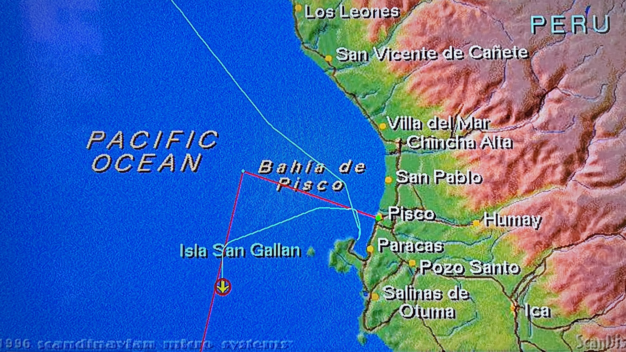 These little gray geckos scurry along on the dry seaweed. I have a little research to do to find out the name of the specie.Almost time to leave Pisco, at about 5 pm this afternoon. The anchoring ropes are still in place but the dock workers are standing by to loosen them. Here is where we were at about 8 o’clock tonight: leaving the shores of Peru behind and sailing south towards the coast of Chile.