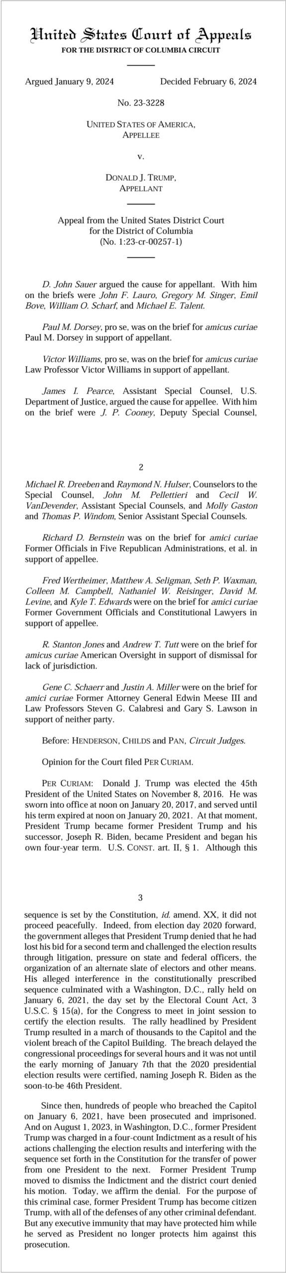 ‘Today, we affirm the denial. For the purpose of this criminal case, former President Trump has become citizen Trump, with all of the defenses of any other criminal defendant. But any executive immunity that may have protected him while he served as President no longer protects him against this prosecution’.