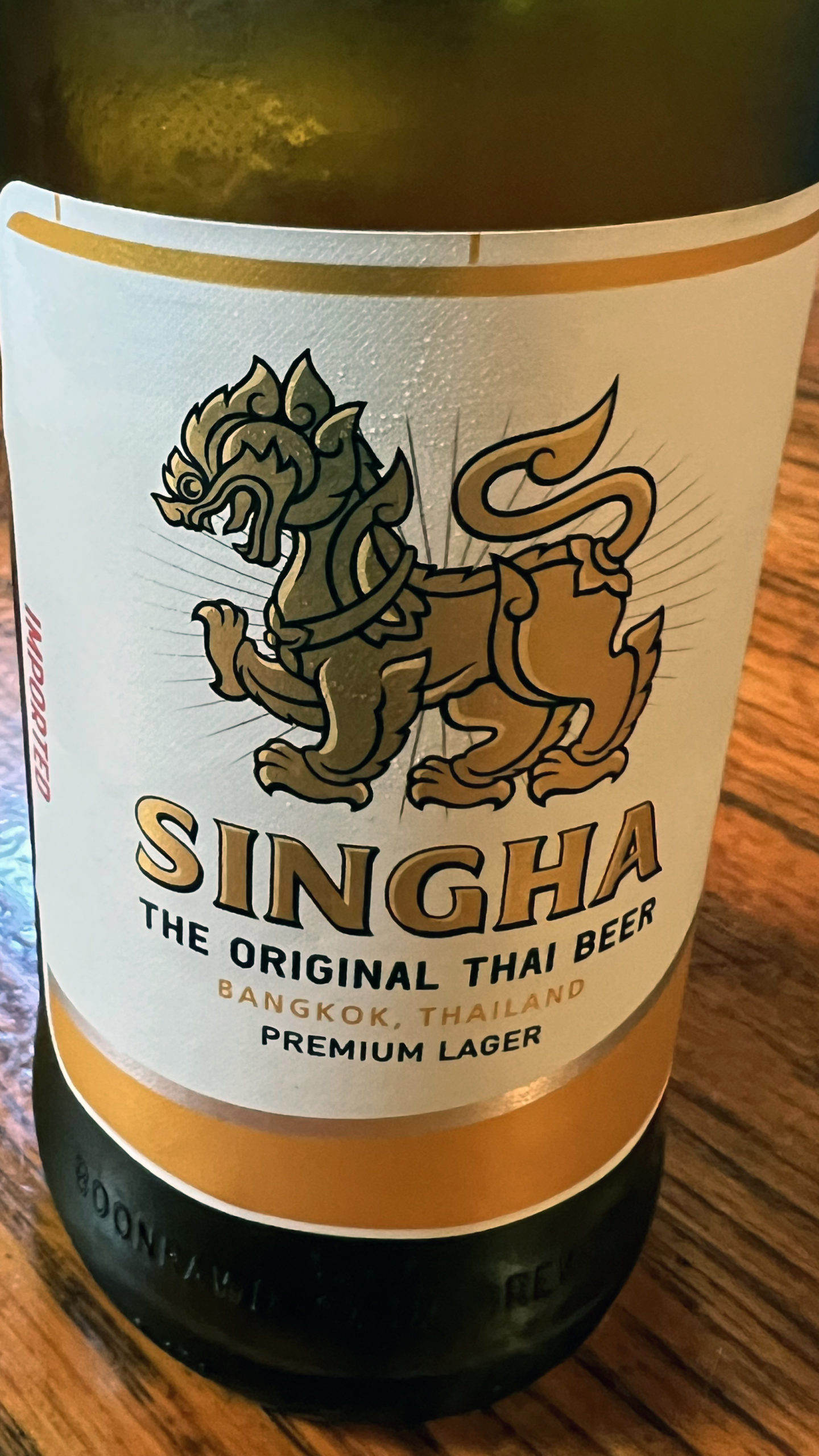 My beer from Jamjuree Thai restaurant tonight. The golden mystical lion on the Singha beer label was inspired by one of the four great lions in Thai literature. The lion is the the king of the legendary Himmapan Forest.