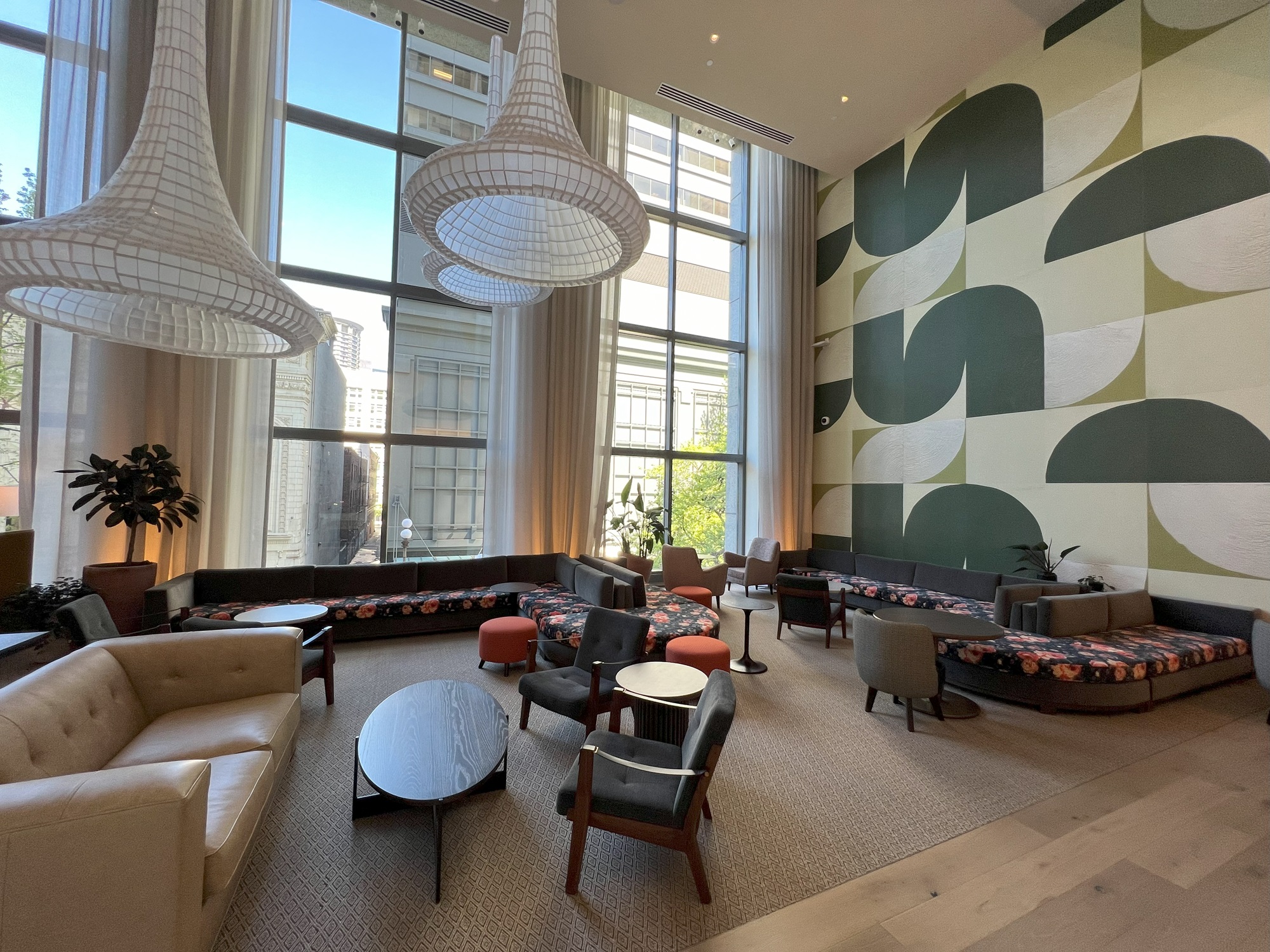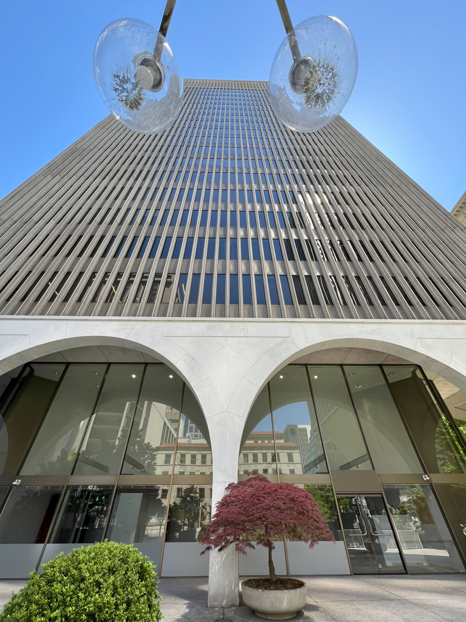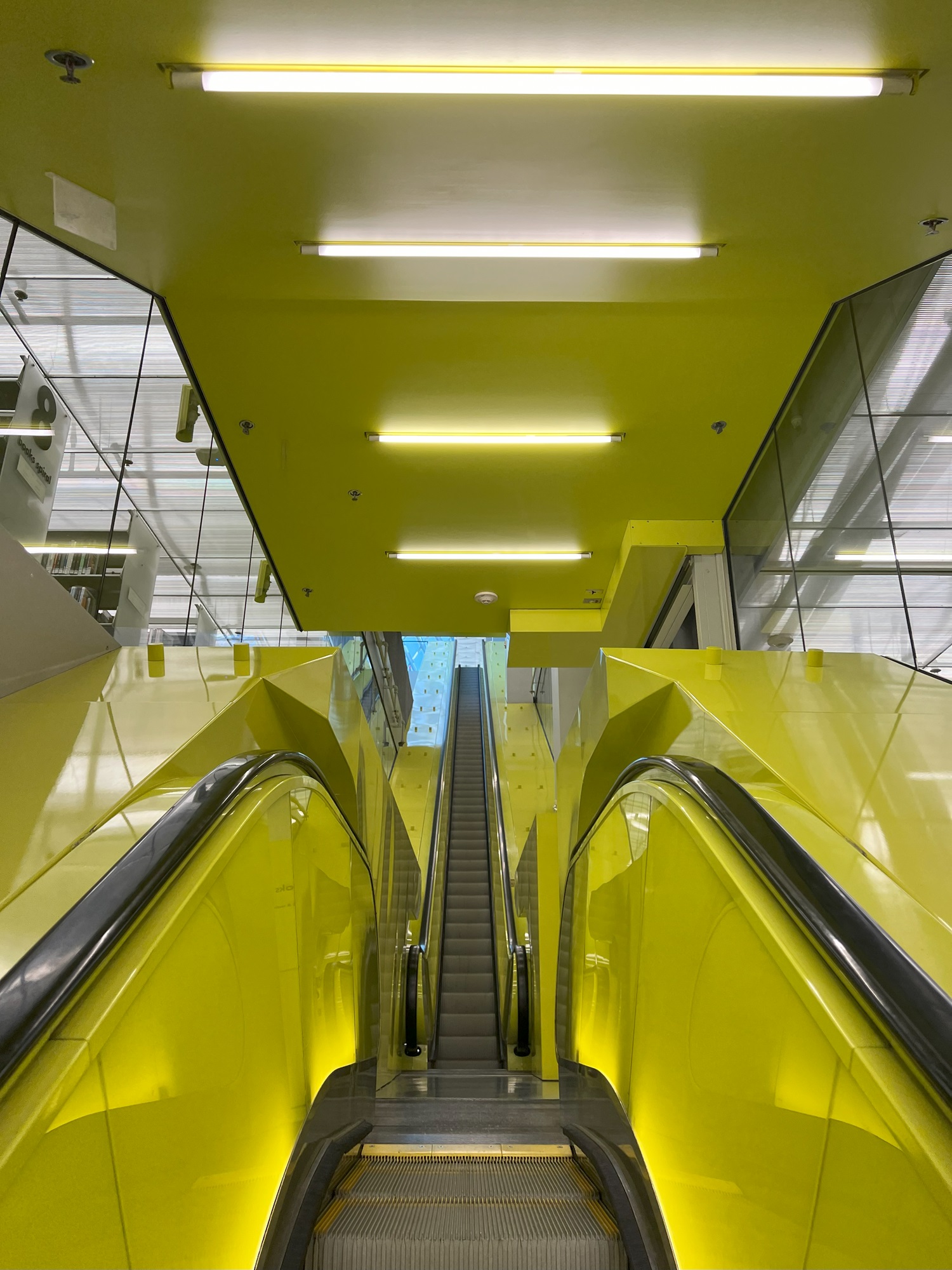 Beautiful blue skies and 74°F (23 °C) is what we had today here in the city. Fifteenth Ave E where I had planned to depart from is in rough shape, and the No 10 bus stop by Republican St is non-existent for now. (I walked down to the corner of 15th and John to the next stop).Now entering downtown on the No 10 bus, and here is the new part of the expanded Seattle Convention Center.This lovely lounge is on the second floor in the US Bank Building, part of the whole Cedar Hall public space renovation there. (Not many people around, and the vendor spaces for espresso and pastry shops downstairs are still mostly empty).Done with lunch and now I’m making my way to the Seattle Central Library. This is the IBM Building at 1200 Fifth Avenue, designed by renowned architect Minoru Yamasaki in 1964. The 20-story building features twelve stone arches, an elegant spiral staircase and a glass-enclosed and newly renovated, modern lobby.Another view of the arches of the IBM Building. That’s Fifth Avenue ahead.Seattle Public Library building with its 11 floors, and glass and steel ‘diamonds’ exterior, opened to the public 20 years ago, on May 23, 2004.I always feel compelled to take a picture when I take the escalator upstairs with the neon lighting and neon-yellow paint.I spent a little time going back in time (to the 50s, 60s and 70s) by checking out a few vintage magazines on Level 6 of the Books Spiral (a walkway that spirals from one floor to the next at almost imperceptible incline, with access to rows of bookshelves).