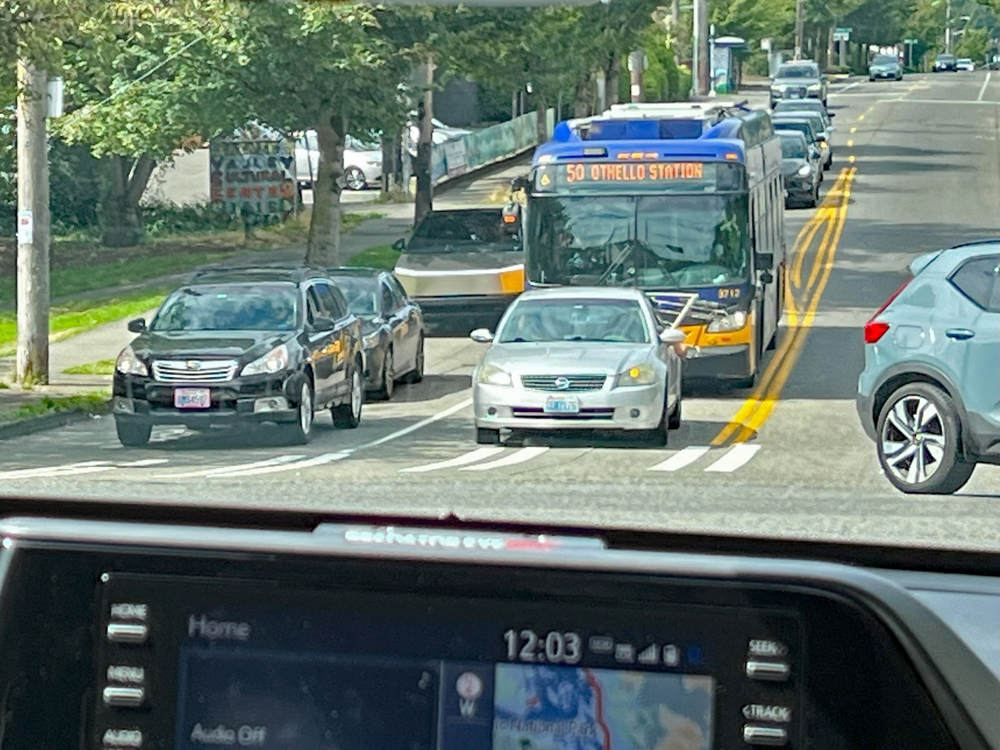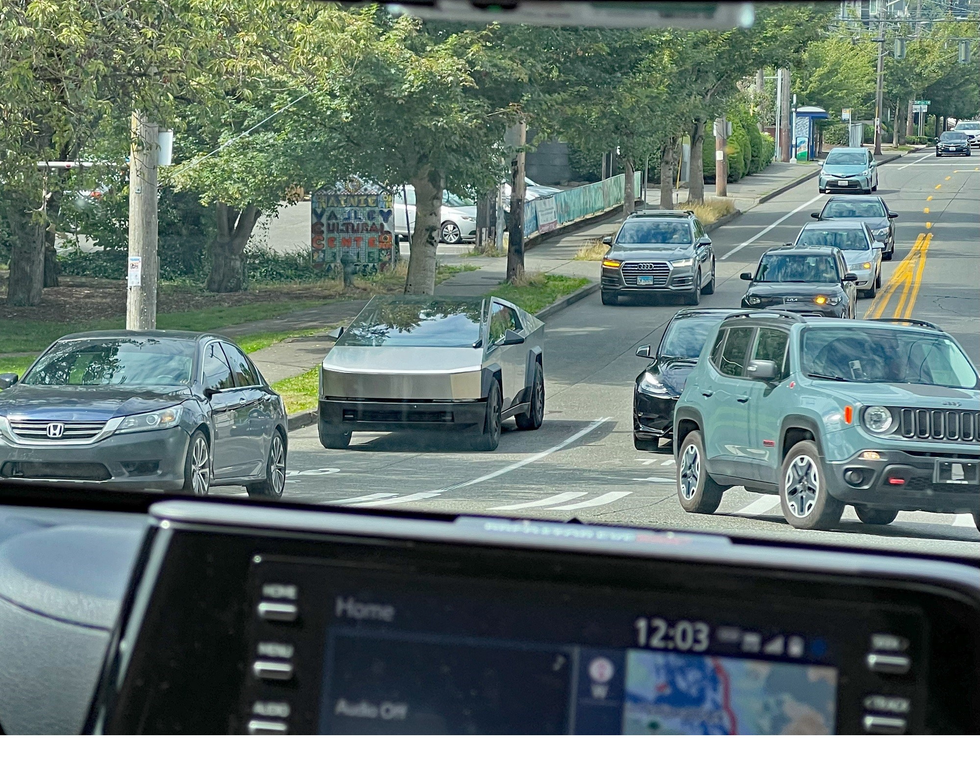 We spotted this Cybertruck at noon today, at the junction of South Alaska Street and Rainier Avenue South. (Looks like a black Tesla Model 3 on its right, in the second picture. It could also be a Model Y).