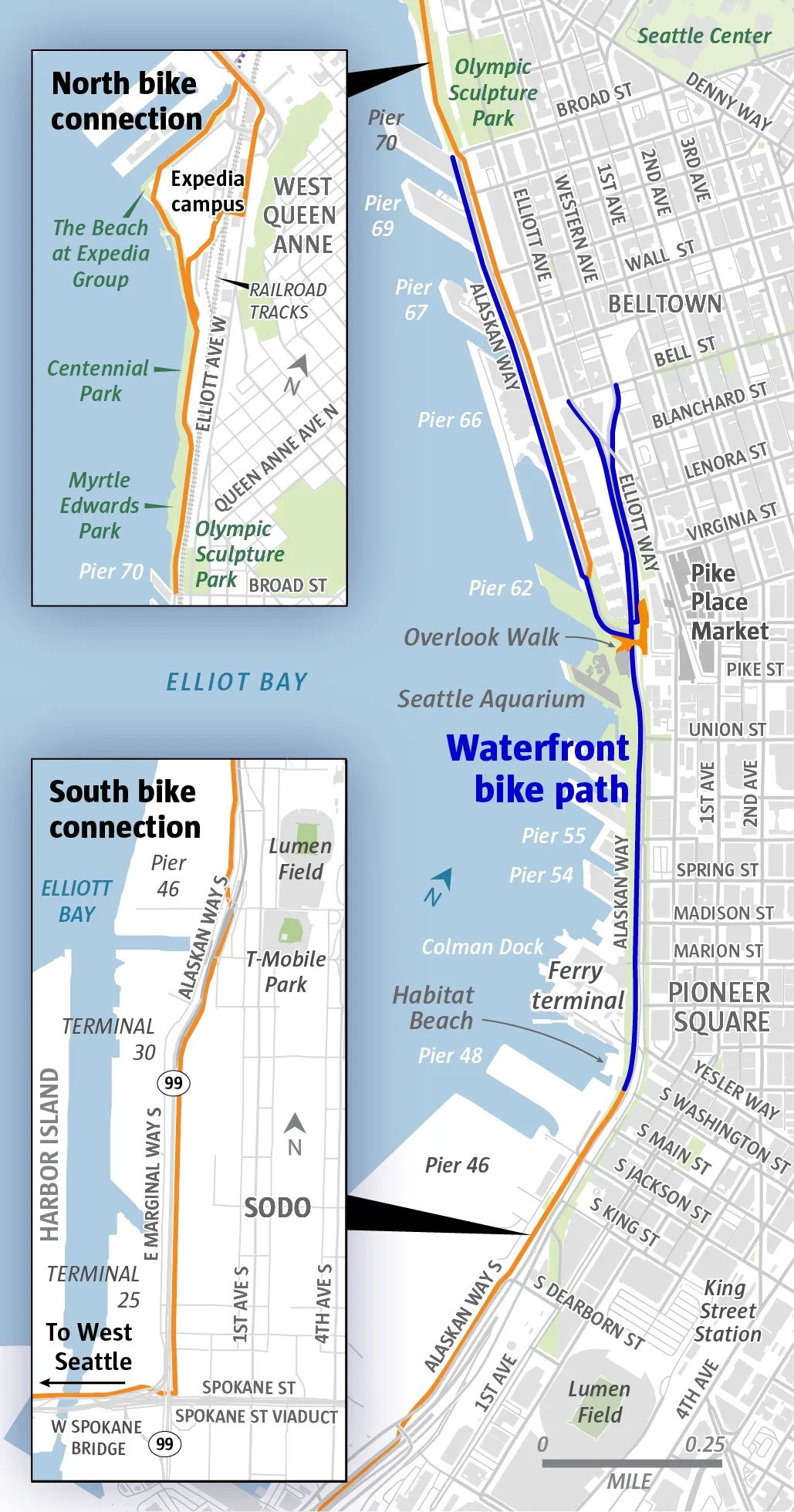 Our rendezvous point for starting the bike ride was Molly Moon Ice Cream up ahead. I’m stopping for a moment to admire Buster Simpson’s public artwork called “Anthropomorphic Dolos*”. Dolosse* is a South African invention, first deployed in 1964 on the breakwater of East London, a South African port city. * A dolos (plural: dolosse) is a wave-dissipating concrete block used in great numbers as a form of coastal management. It is a type of tetrapod. Weighing up to 8 tonnes (8.8 short tons), dolosse are used to build revetments for protection against the erosive force of waves from a body of water. [From Wikipedia]We pedaled northbound along the Waterfront bike path and the North bike connection. [Sources: Seattle Department of Transportation, Elliott Bay Connections, Seattle Office of the Waterfront and Civic Projects. Esri, Google, Chris Kaeser / The Seattle Times]