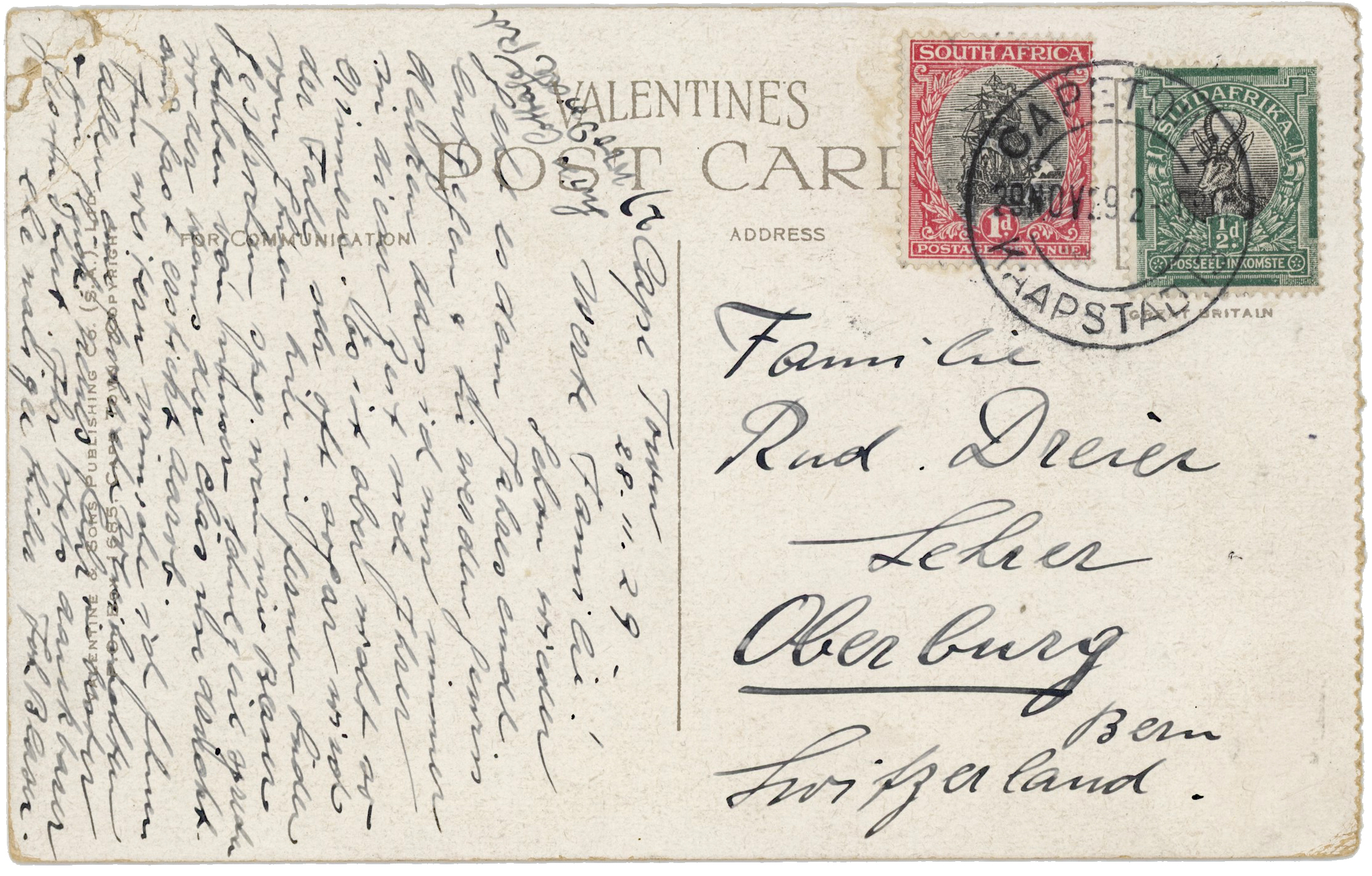 The sender’s address is from the suburb of Tamboerskloof on the slopes of Table Mountain in the city (Cape Town).