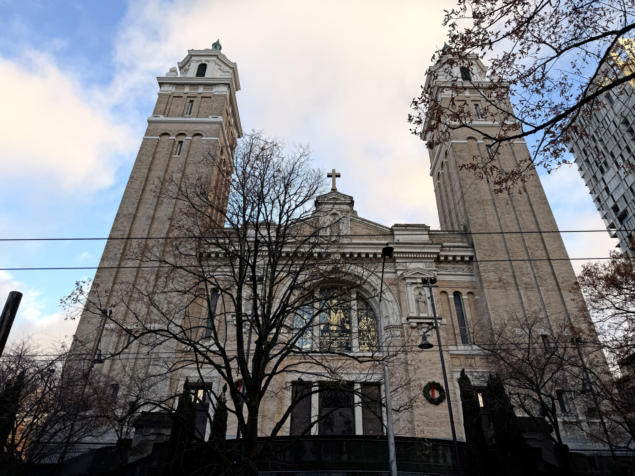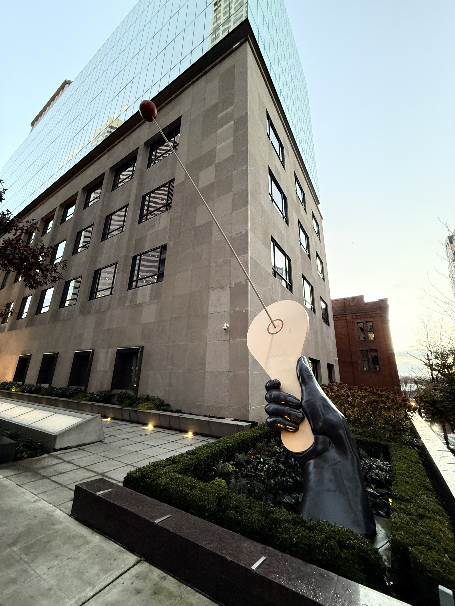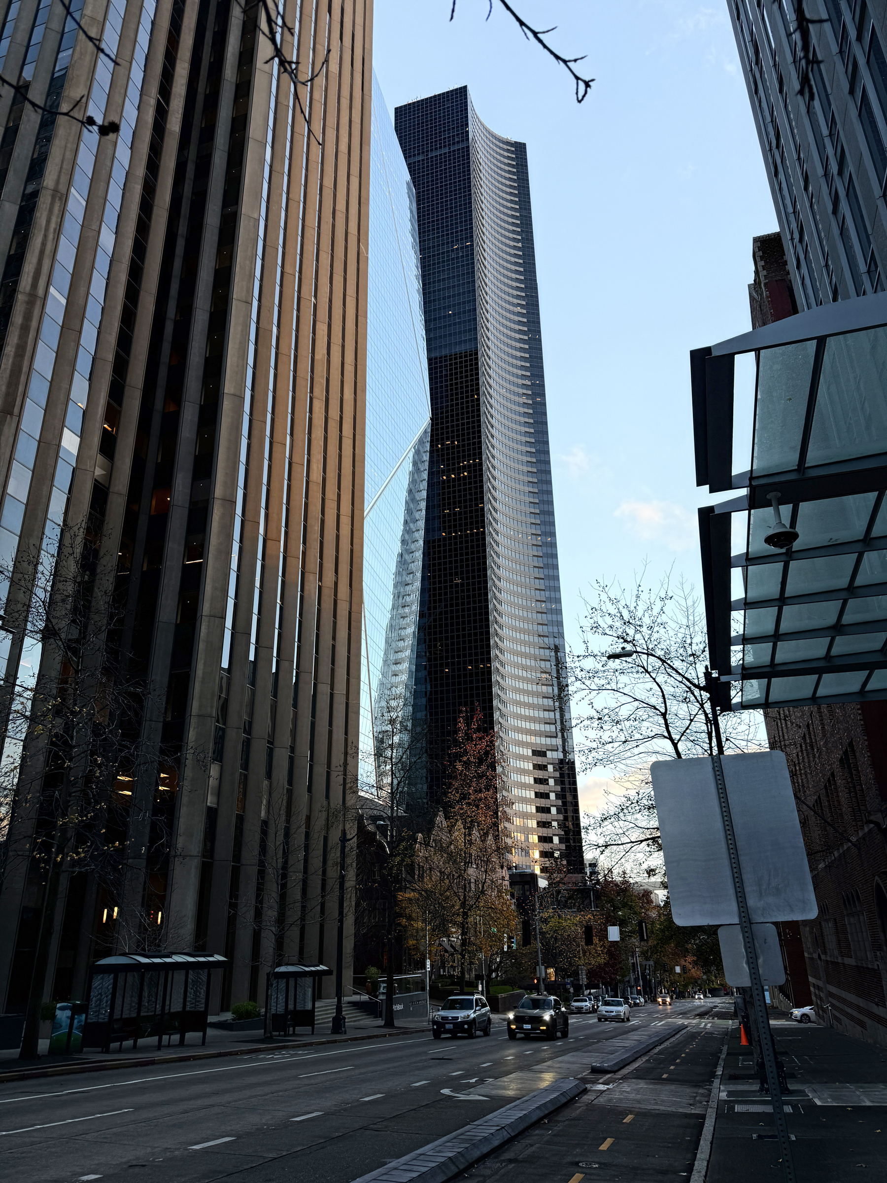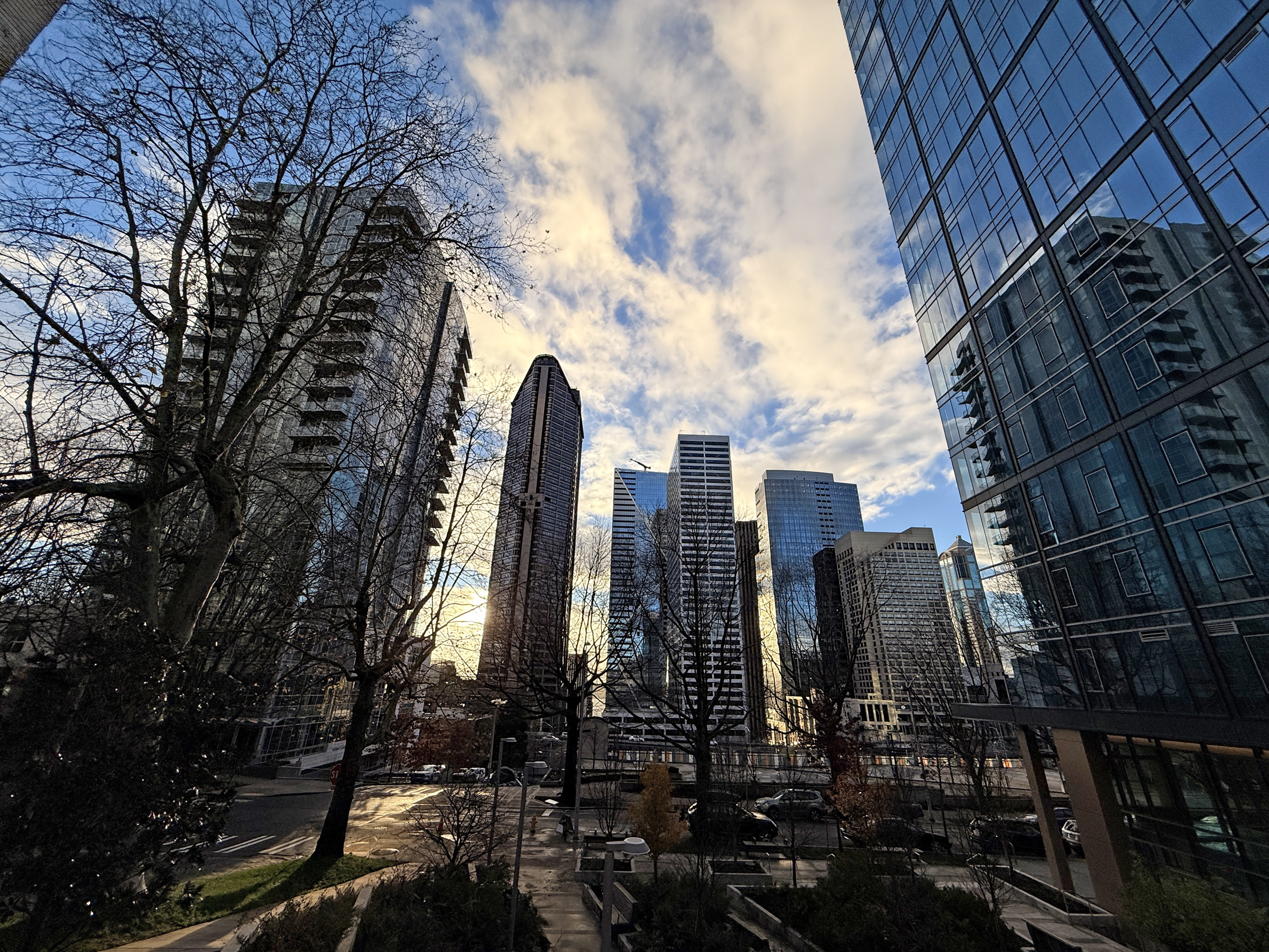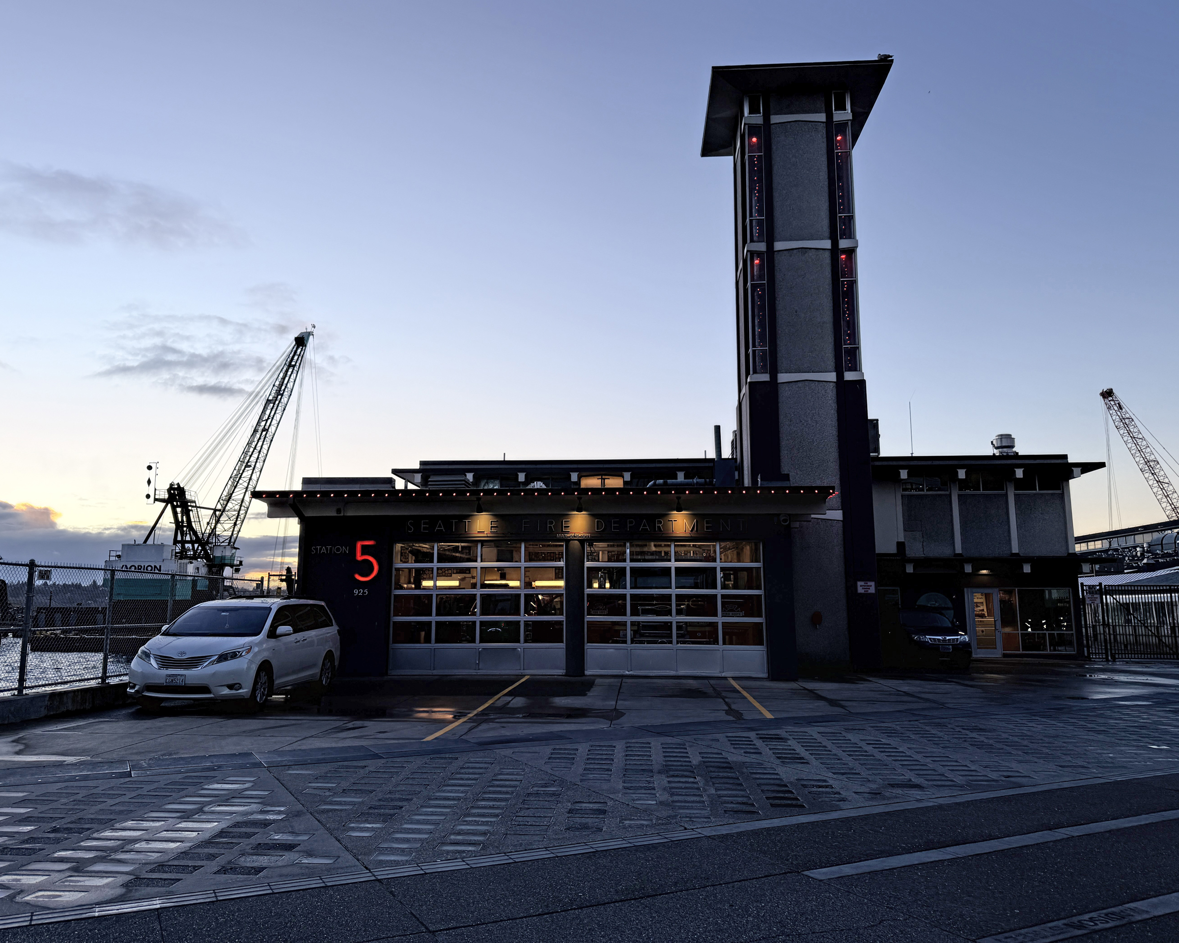 The Graystone at 800 Columbia St was actually built in 2021 (how time flies). It has 31 stories and 271 units. This is the view from the parking lot on 8th Avenue, looking northeast. (On the right, just a block or so away, is the Museum House complex with its twin towers).Now I am on Columbia Street, walking up hill. I should have taken a picture without the tree! but there is a waterfall feature on the right that obscures the street view into the condo’s gym somewhat. There are several other amenities of course, such as a rooftop deck and meeting rooms and all that.Here’s the view of the downtown skyline, looking towards the west. Interstate 5 is close by, but at a much lower level which dampens any traffic noise one might hear.Now walking to the Museum House complex on Terry Avenue. This apartment building opened in March, and features a north tower and a south tower, each with 32 stories. It offers 506 rental units.Looking up at the main facade of the building. The skybridge is all the way up on Floor 31.First Hill has several hospitals and buildings with clinics and doctors’ offices inside. This is Cabrini Center on Boren Avenue, completed in 1973 with 18 towers.St. James Cathedral is a Catholic cathedral located at 804 Ninth Avenue. It was dedicated in 1907.All right. The sun is going to set soon and I am heading to the waterfront. Here’s a look at the traffic on I-5 (looking south).Beautiful colors reflected by the windows of the Crowne Plaza hotel in downtown. The hotel was completed in 1980 and has 18 floors.Seattle’s weird library with its faceted frames of glass and steel has 11 floors. It opened in May 2004 to the public.Further south along 4th Avenue is the Columbia Tower, at 76 stories still the tallest structure in the state of Washington. (Getting squeezed out of view from here a little bit by the F5 Tower in front of it that opened in 2017).Heading down to the waterfront now. It’s good that I snapped this picture of the sun behind the clouds, because it was gone for the day just a few minutes later.Seattle has 33 fire stations and the one on the waterfront is No 5. The original Fire Station No. 5 building opened here at this location in 1902.Here are the first cars rolling onto the Walla Walla ferry at Colman Dock (Seattle Ferry Terminal), for its departure to Bremerton. Look at the windsock and choppy water: there is a strong breeze.On my way back to the G-line bus stop. Here is “What Goes Up Must Come Down” — the giant paddle-ball sculpture by Catherine Mayer at 2nd Avenue and Spring St. It is about 42 feet tall and made of fiberglass and steel.