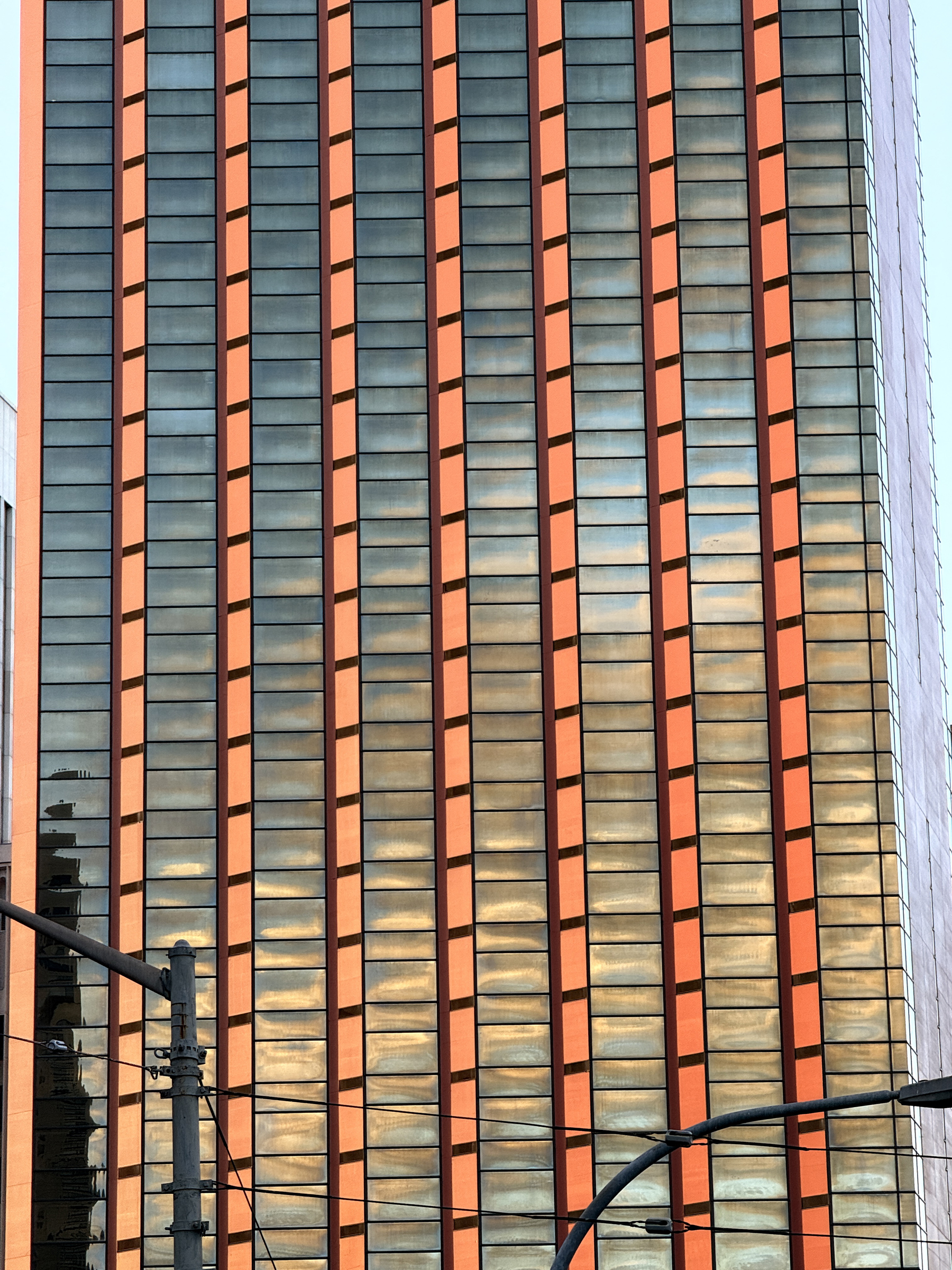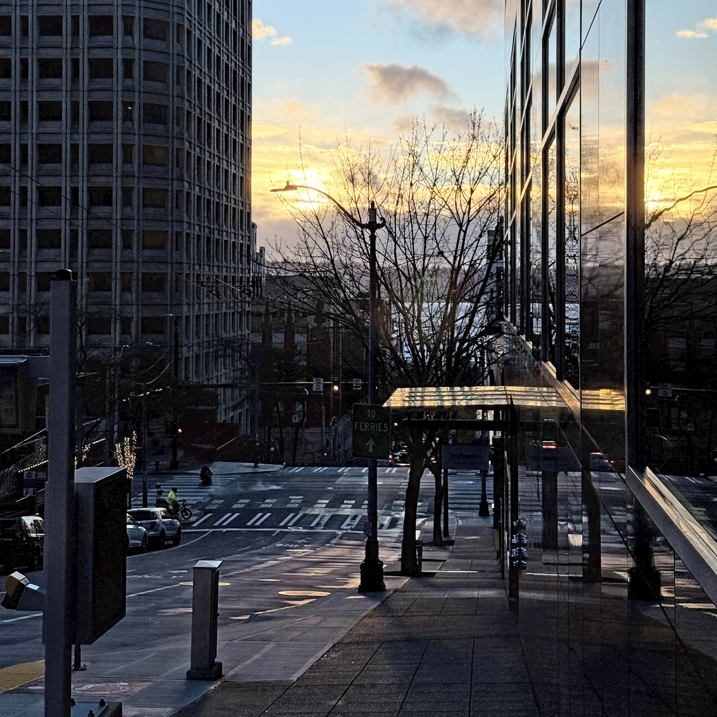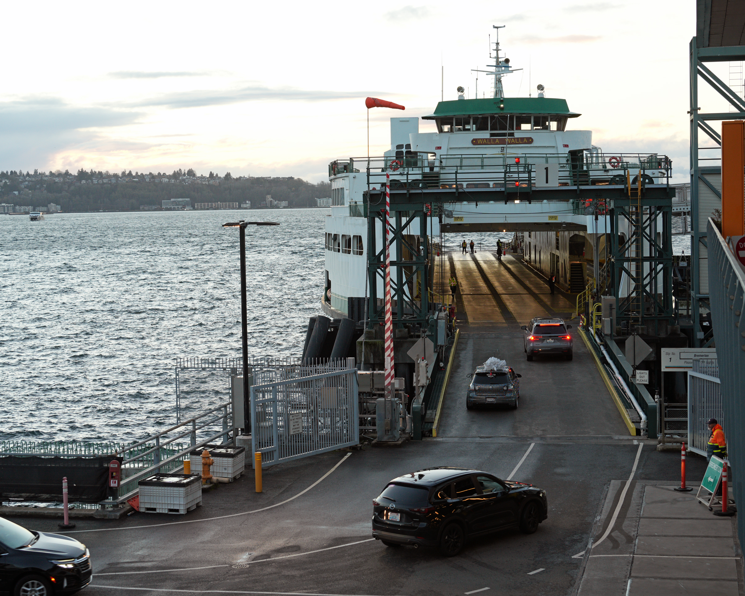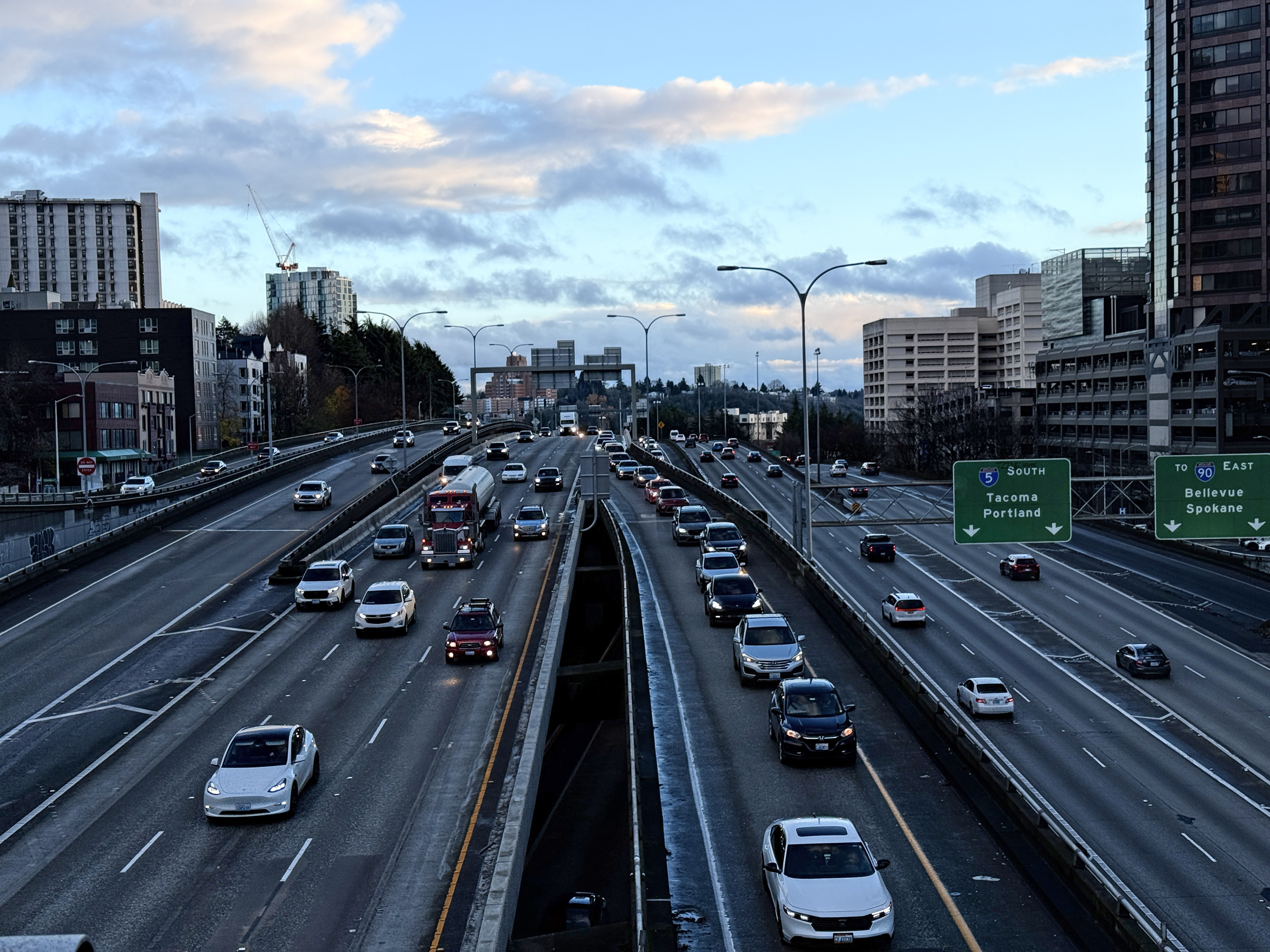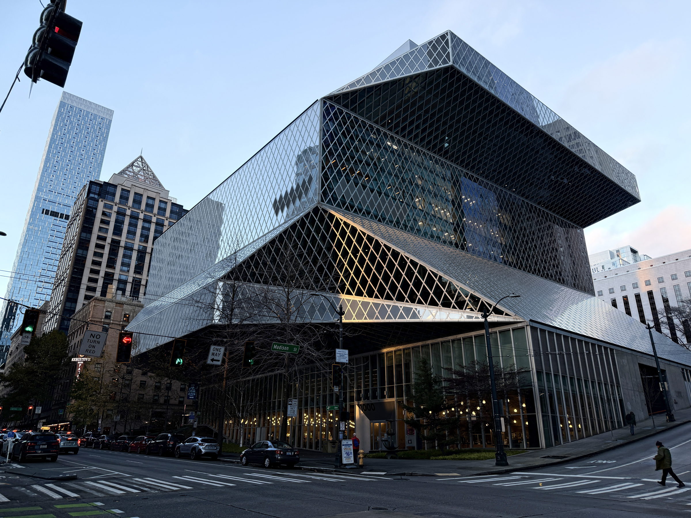 The Graystone at 800 Columbia St was actually built in 2021 (how time flies). It has 31 stories and 271 units. This is the view from the parking lot on 8th Avenue, looking northeast. (On the right, just a block or so away, is the Museum House complex with its twin towers).Now I am on Columbia Street, walking up hill. I should have taken a picture without the tree! but there is a waterfall feature on the right that obscures the street view into the condo’s gym somewhat. There are several other amenities of course, such as a rooftop deck and meeting rooms and all that.Here’s the view of the downtown skyline, looking towards the west. Interstate 5 is close by, but at a much lower level which dampens any traffic noise one might hear.Now walking to the Museum House complex on Terry Avenue. This apartment building opened in March, and features a north tower and a south tower, each with 32 stories. It offers 506 rental units.Looking up at the main facade of the building. The skybridge is all the way up on Floor 31.First Hill has several hospitals and buildings with clinics and doctors’ offices inside. This is Cabrini Center on Boren Avenue, completed in 1973 with 18 towers.St. James Cathedral is a Catholic cathedral located at 804 Ninth Avenue. It was dedicated in 1907.All right. The sun is going to set soon and I am heading to the waterfront. Here’s a look at the traffic on I-5 (looking south).Beautiful colors reflected by the windows of the Crowne Plaza hotel in downtown. The hotel was completed in 1980 and has 18 floors.Seattle’s weird library with its faceted frames of glass and steel has 11 floors. It opened in May 2004 to the public.Further south along 4th Avenue is the Columbia Tower, at 76 stories still the tallest structure in the state of Washington. (Getting squeezed out of view from here a little bit by the F5 Tower in front of it that opened in 2017).Heading down to the waterfront now. It’s good that I snapped this picture of the sun behind the clouds, because it was gone for the day just a few minutes later.Seattle has 33 fire stations and the one on the waterfront is No 5. The original Fire Station No. 5 building opened here at this location in 1902.Here are the first cars rolling onto the Walla Walla ferry at Colman Dock (Seattle Ferry Terminal), for its departure to Bremerton. Look at the windsock and choppy water: there is a strong breeze.On my way back to the G-line bus stop. Here is “What Goes Up Must Come Down” — the giant paddle-ball sculpture by Catherine Mayer at 2nd Avenue and Spring St. It is about 42 feet tall and made of fiberglass and steel.
