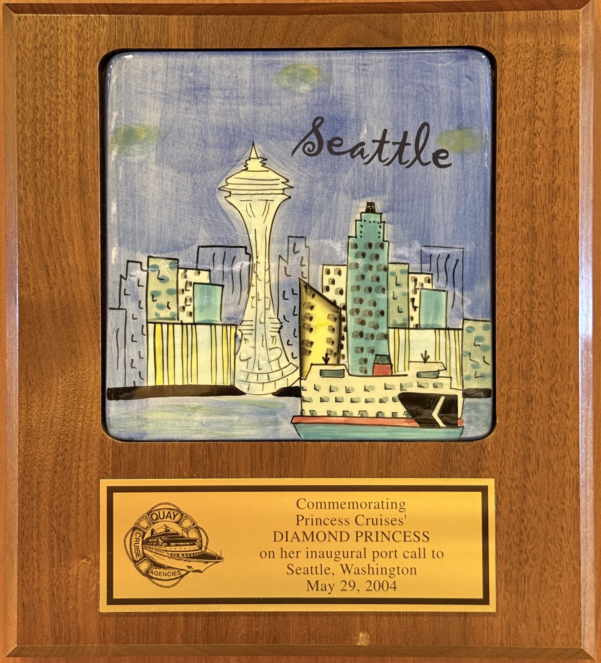 The plaques with artwork on them are from the walls on the Promenade Deck. They commemorate the dates when the Diamond Princess called ports around the world.
