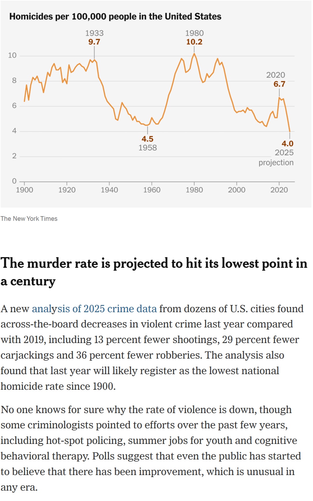 Violent crime in the U.S. is down significantly when measured against numbers from 2019, reports the New York Times in its newsletter called This Evening.