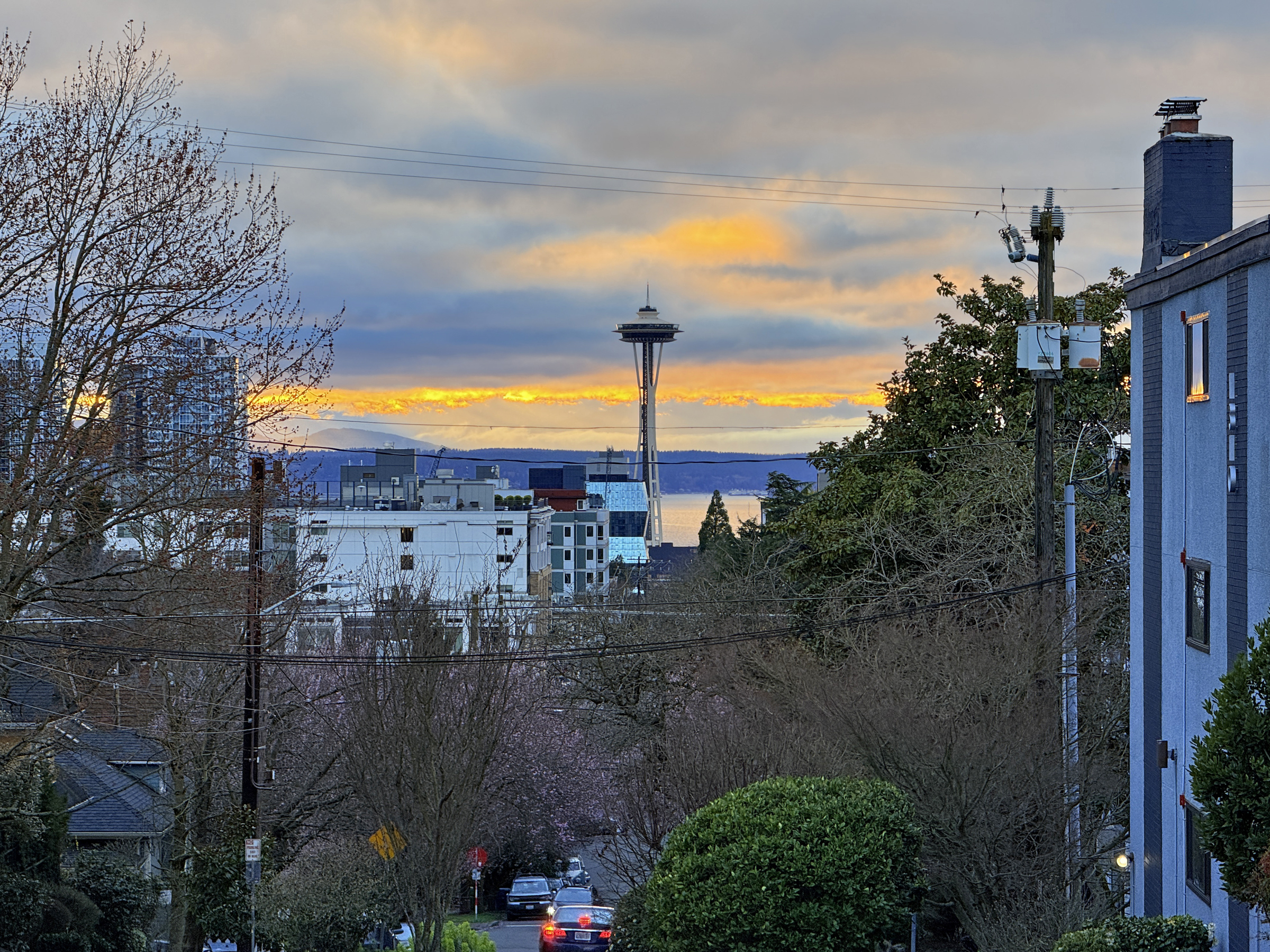 Posted on March 7, 2026March 7, 2026 by WillemSaturday 🌇 There were clouds and a little rain today here in the Emerald City. It was 54°F (12°C) outside when I went for a walk just before sunset. The Olympic Mountains were hidden from view tonight, with fiery color bands in the distant skies.