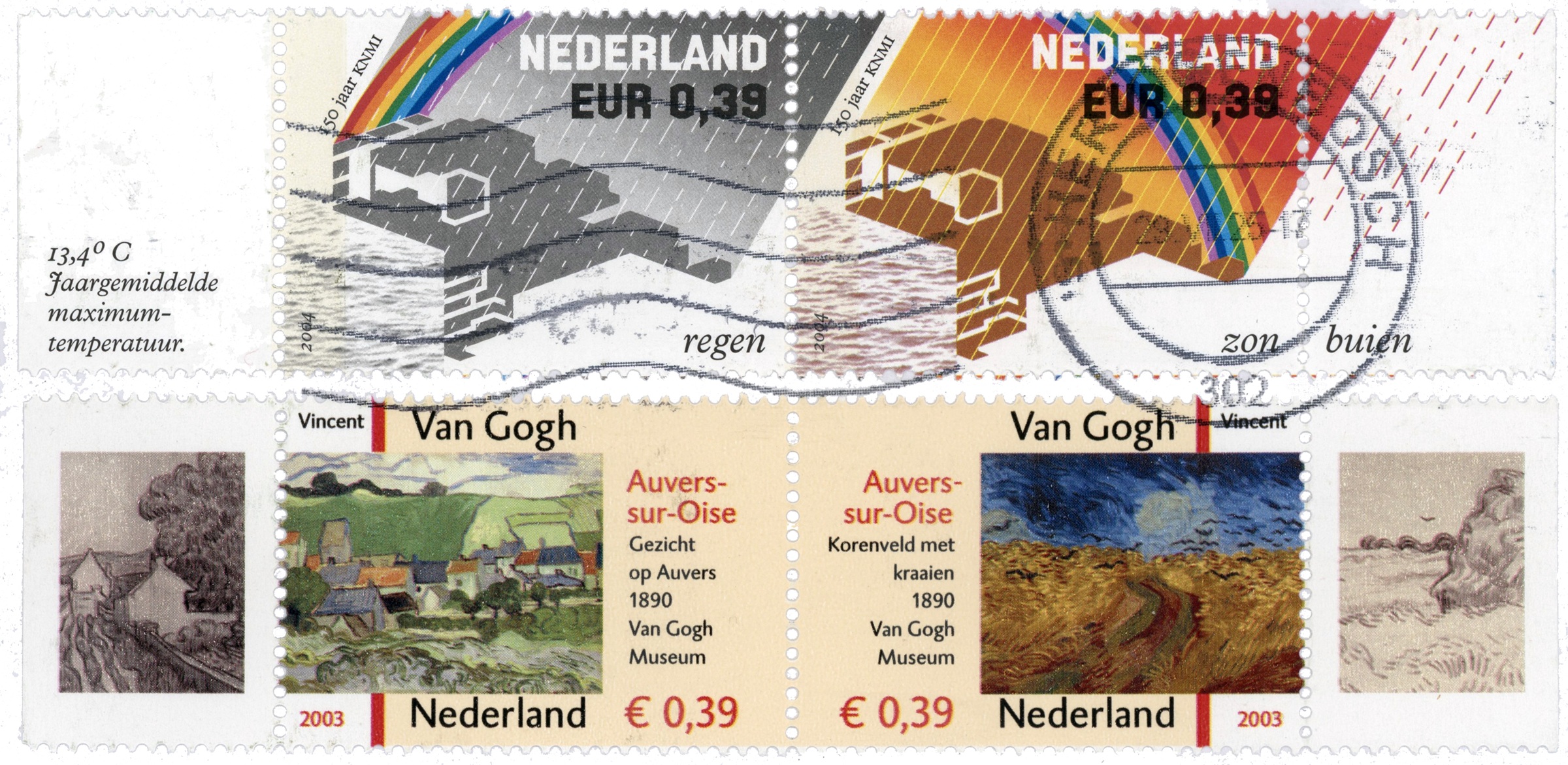 The Netherlands: The 150th Anniversary of the Birth of Vincent Van Gogh Issued Jan. 2, 2003 Perf. 14¾ |Sheets of 10 different stamps |Design: Gracia Lebbink |Litho.|Engraving: House of Questa |No watermark #1142i A438 0.39€ Multicolored |View of Auvers, 1890 #1142j A438 0.39€ Multicolored |Wheat Field with Crows, 1890 [Sources: stampworld.com, Scott 2018 Standard Postage Stamp Catalogue, Vol. 5]