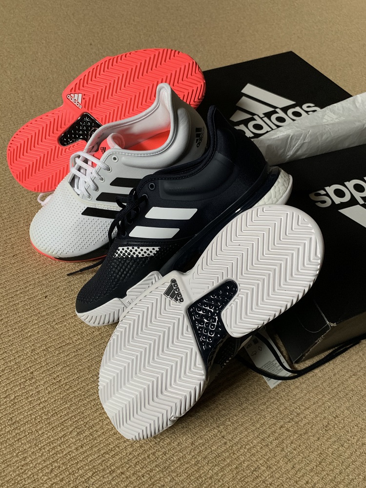 Adidas Sole Court Boost, is the name of these tennis shoes (I paid $129 per pair). I like the herringbone pattern on the sole. The size 9s fit my feet perfectly. There is extra padding in the sole, and a little edge on the outside to provide support for side-to-side movement on the court. World No 3 Dominic Thiem likes to play with the white ones with the pink soles.