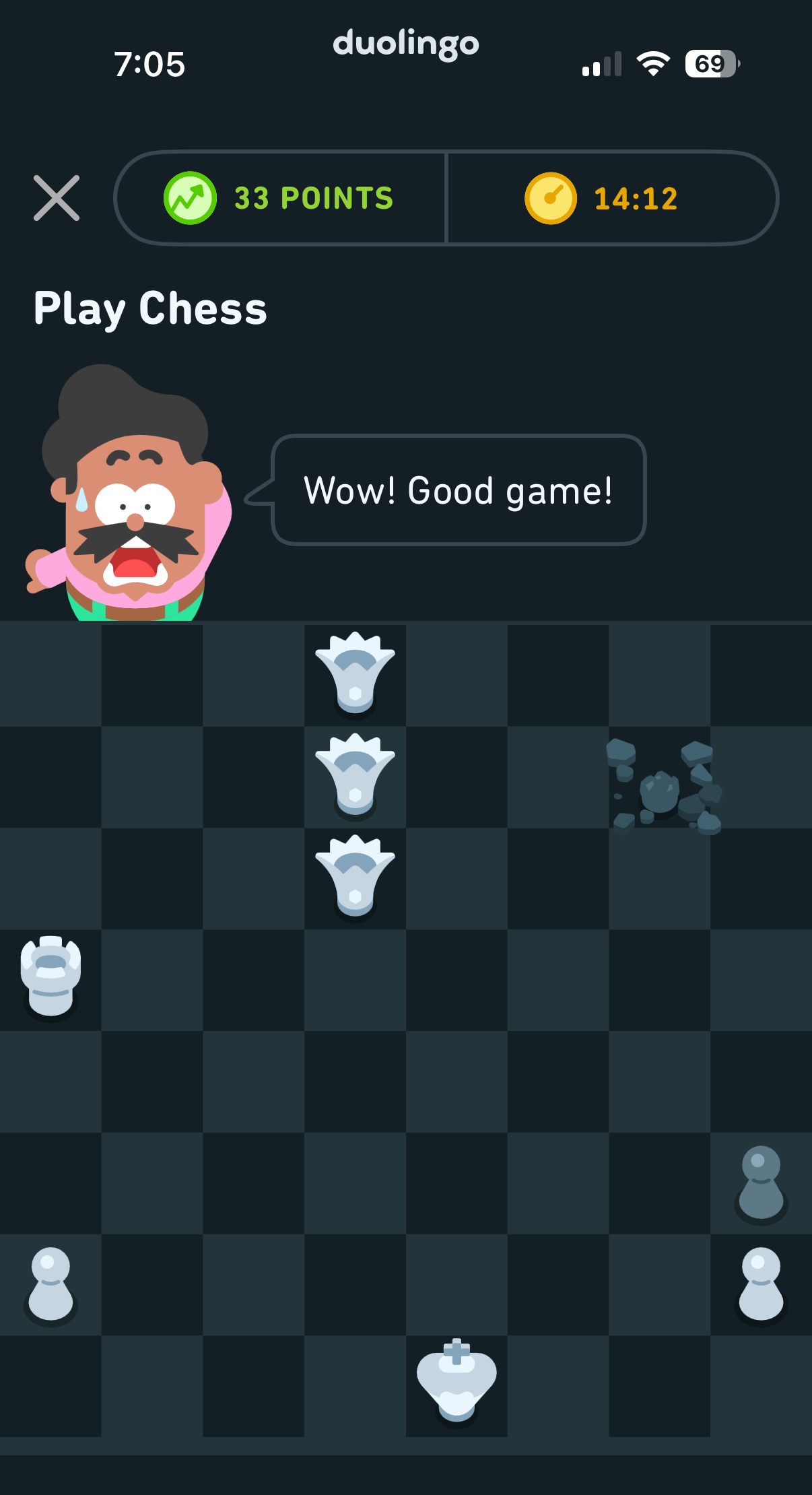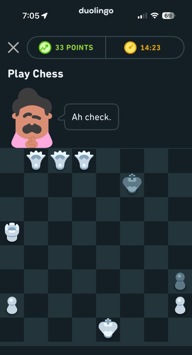 I kept thinking Oscar (the Duolingo chess program bot) would throw in the towel and resign, but no.