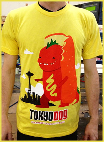 I spotted this ‘Tokyo dog’ truck here on 15th Ave on Capitol Hill. If I find it again I will try their Shinjuku veggie dog : apple sauce sausage with butter teriyaki onions, wasabi mayo and nori (seaweed).And here is a t-shirt that’s for sale from their website. Looks to me like a play on Godzilla – that gargantuan ‘dog’ stalking the Space Needle.