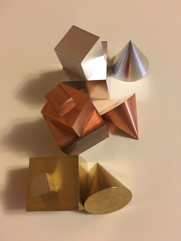Here’s another ‘souvenir’ acquisition I made in Japan – these from a hardware store called Tokyu Hands in Tokyo. (I have a little thing for pure metal objects or ingots). The cubes and cone casts are made of brass*, pure copper and pure aluminum. I think these are made available for science class in schools, more than anything else. There was a pure lead ingot for sale as well, but lead is poisonous and I did not want that in my house.