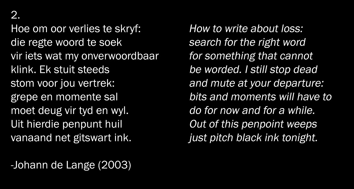Above: a stanza from a 2003 poem by Johann de Lange (Afrikaans). I tried my hand at a rough translation, on the right.