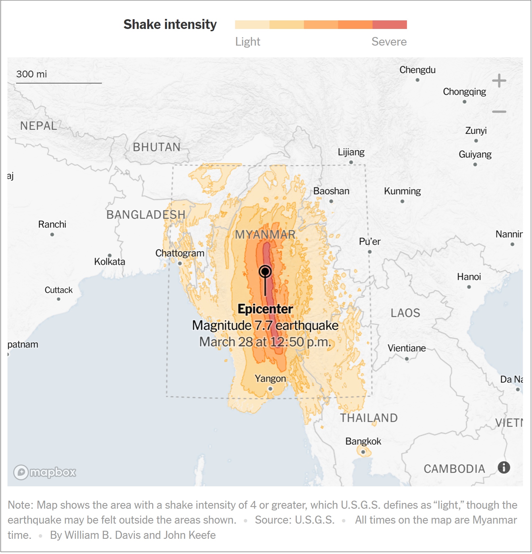 Central Myanmar, the scene of a powerful earthquake on Friday, lies near the eastern end of one of the world’s most active zones of seismic activity: the Alpide Belt, which extends from the Mediterranean Sea eastward through Turkey, Iran and Afghanistan, then along the Himalayas to Myanmar and finally Indonesia.