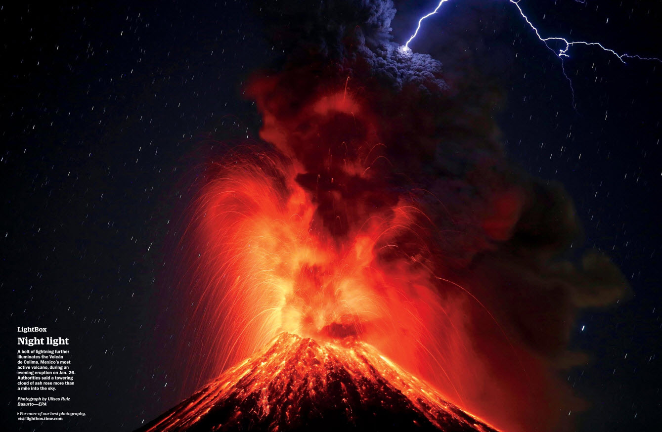 There was an eruption at the volcano of Colima in Mexico on Jan. 26. (I did not even know there really are volcanoes in Mexico!). This volcano is the most active in Mexico, and the night-time picture from Uleses Ruiz Basurto in TIME magazine features a volcanic lightning bolt as well. Whoah .. better to keep some distance when earth and the heavens are this angry!