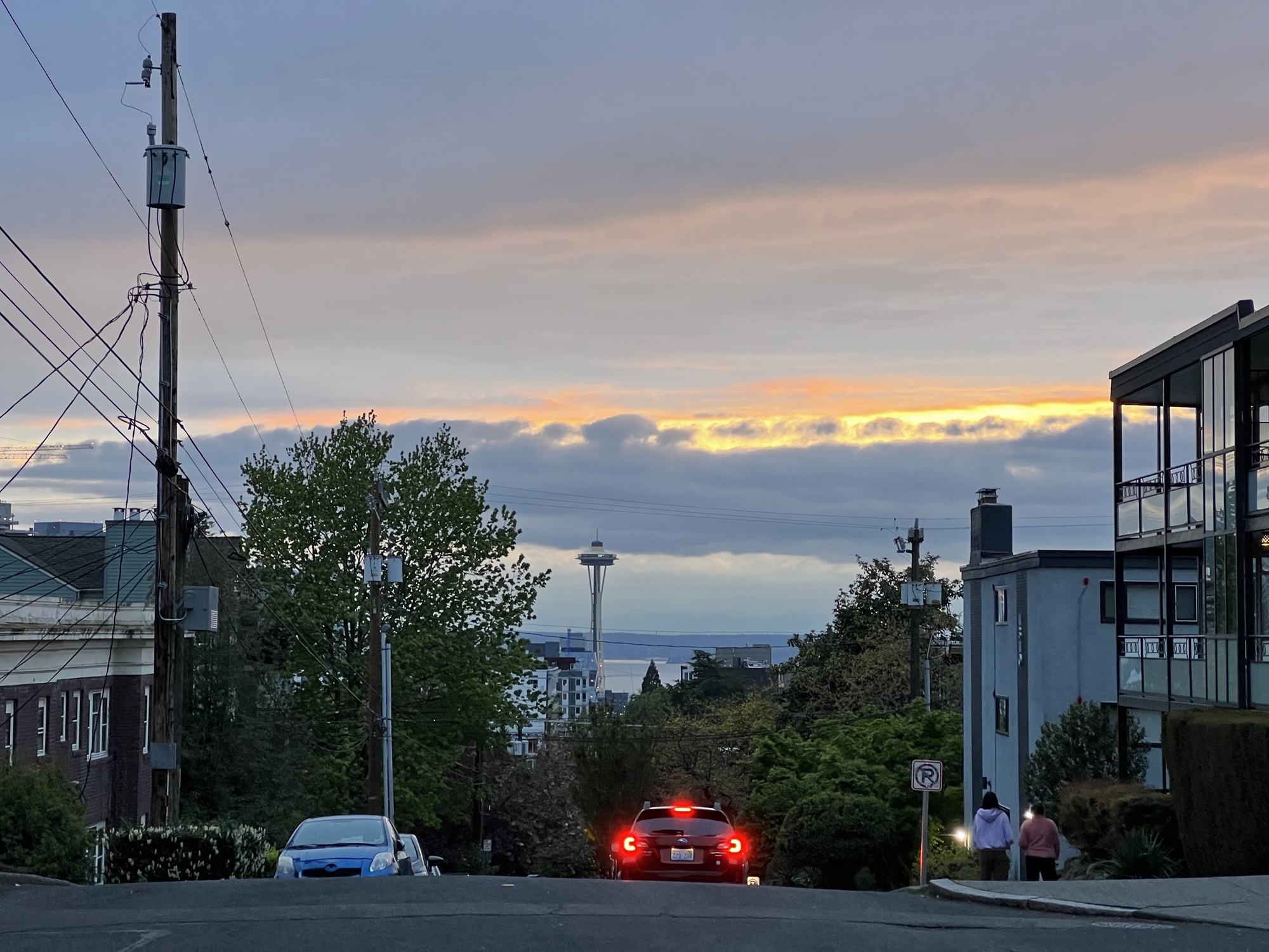 Hey! Three gray Teslas at the Madison Street & Broadway intersection. (I had missed the G-line bus up at the 17th Avenue stop by a minute and now I’m walking down Madison Street to the stop on Boylston Avenue).Now I’m at the Boylston Avenue stop, and looking back up along Madison Street to see if the bus is coming. Yes! there it is at the top of the hill. Can you see it?I hopped off the stop at 1st Avenue near the waterfront. I could not resist taking a picture of the beautiful The Federal Office Building nearby— constructed in 1932 and ‘an exuberant example of Art Deco architecture’, says Wikipedia.At Colman Dock (Pier 52) now, and a look at the city skyline from there.One of two blue herons on the rocks below catching a little of the last sunlight of the day. It was sunny today, but definitely not warm— 50°F/ 10°C for a high.Art installation on the waterfront promenade. I will have to look up the artist.Here’s the patio by Old Stove Brewing Co. at Pike Place Market with its lovely overlook of Puget Sound’s Elliott Bay. A Scottish band’s members are playing their drums and bagpipes for the crowd, but I don’t know the band’s name or if it was for a special occasion.Vivid colors on the mural at the entrance to light rail’s Westlake Station downtown. A quick 4-minute ride from here gets me back up to Capitol Hill.
