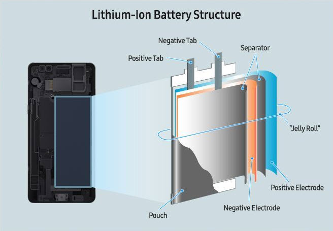 Here’s how a typical modern mobile phone Li-ion battery works, highly simplified. The positive electrodes (cathodes) are typically lithium-doped cobalt oxide; the negative electrodes (anodes) are graphite, with a separator in between. There is also an electrolyte, lithium salts in an organic solvent. A large number of these electrode layers are ‘jelly-rolled’ into the pouch to increase the current that the battery can discharge during its use. Lithium ions migrate back and forth depending if the phone is used, or charged. The electrolyte and electrodes degrade over time, though. Some researchers are working hard to find a solid-state solution (a battery with no electrolyte). They believe these solid-state batteries would last tens of thousands of cycles instead of a few hundred. [Picture: Infographic for Galaxy 7 Note phone, by Samsung]