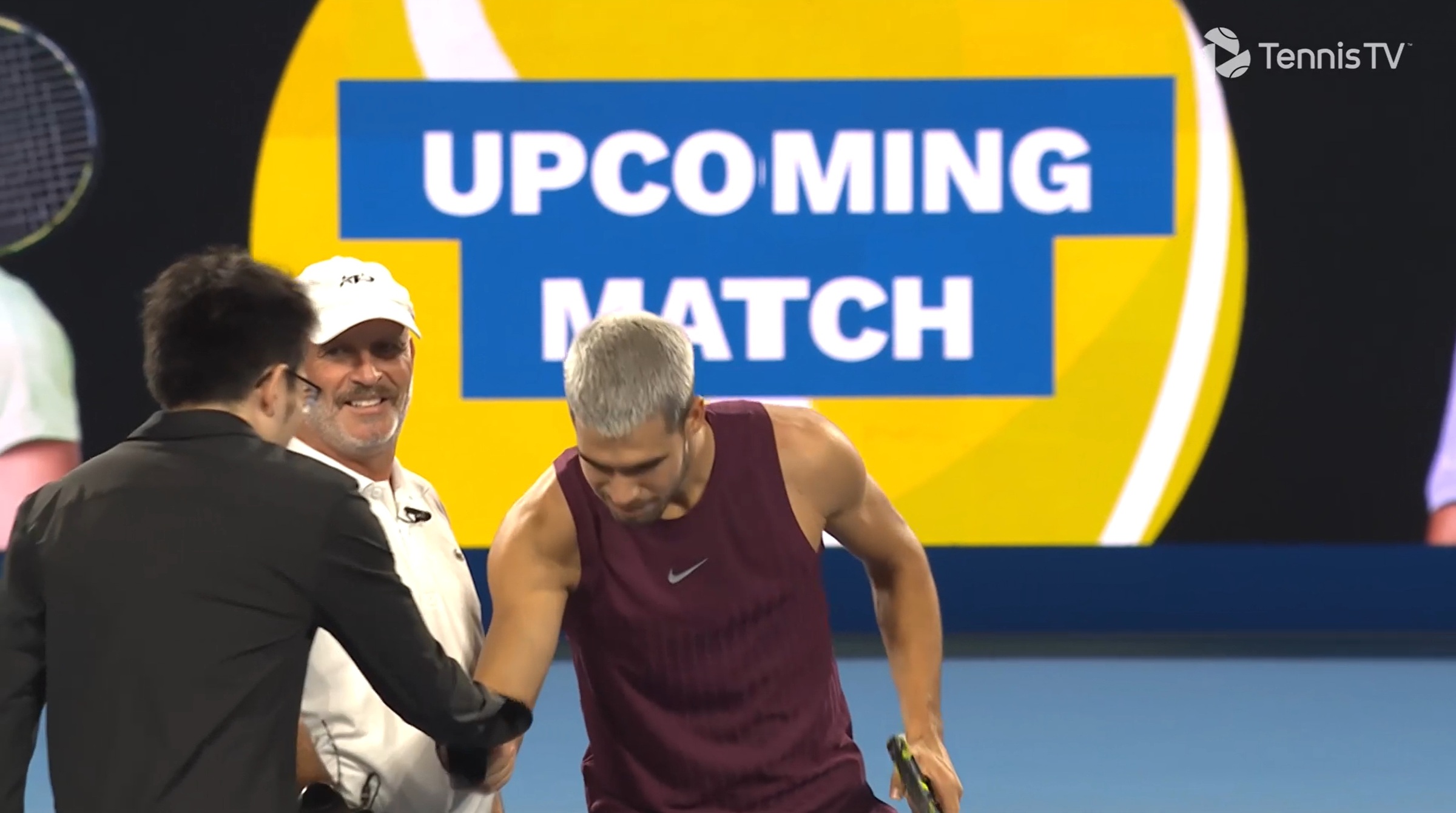 Here’s Carlos at the start of his match against Sebastian Baez— his buzz cut from the US Open now grown out a little (and bleached silver, not blond, he says).