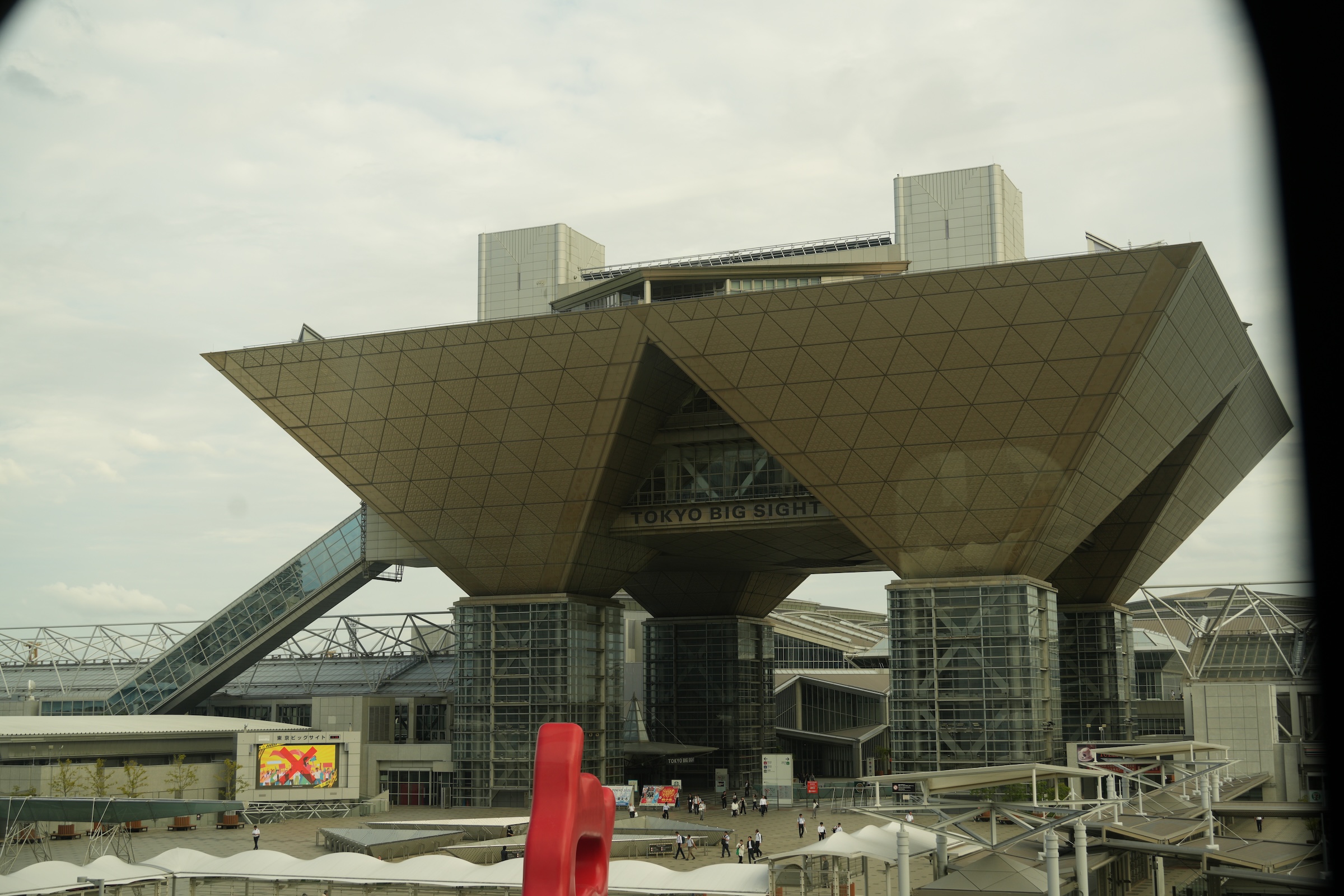 The structures on the left of the track are in Ariake Tennis no Mori Park with its center court Ariake Coliseum.